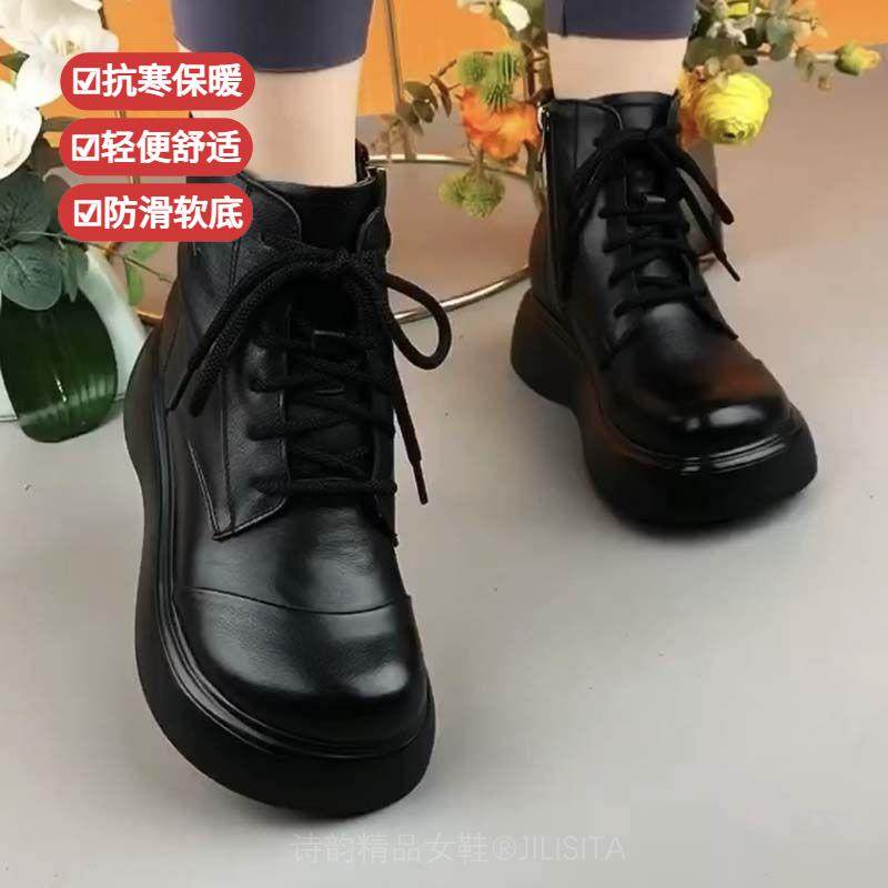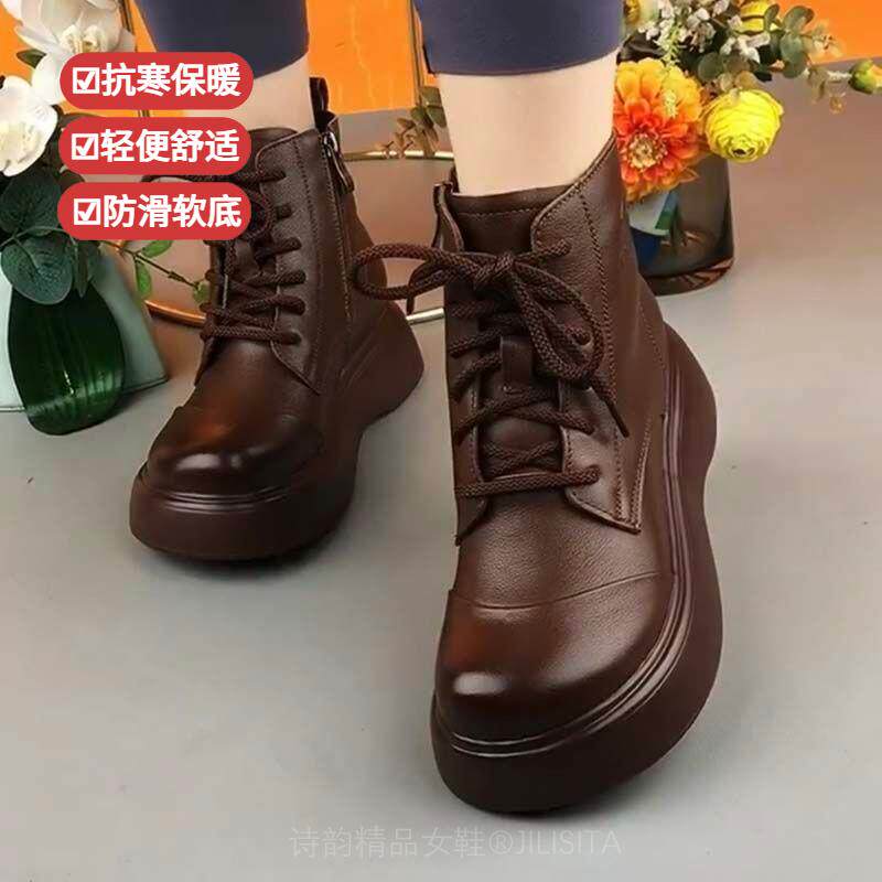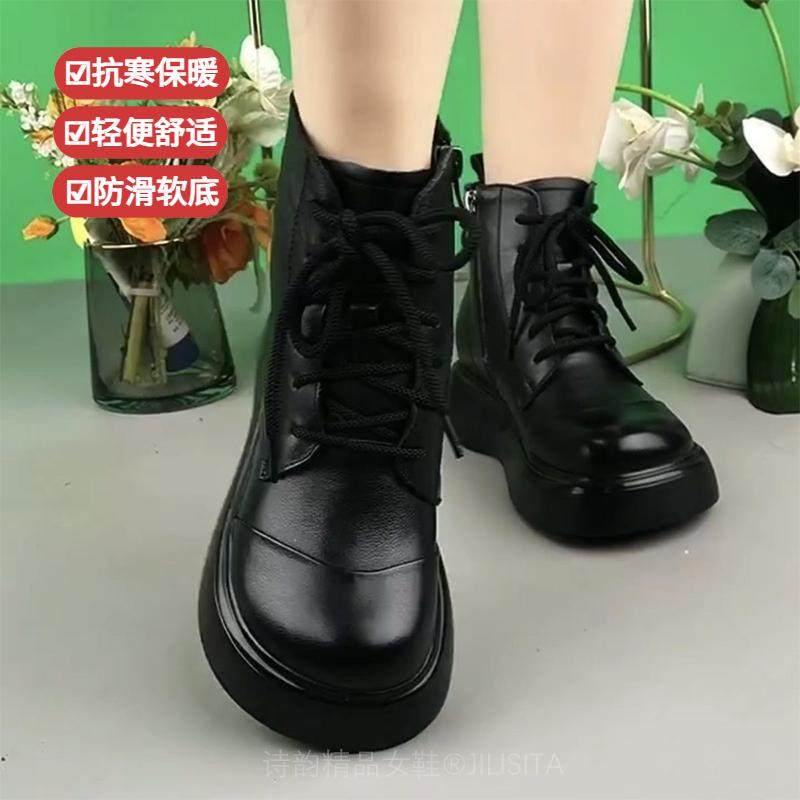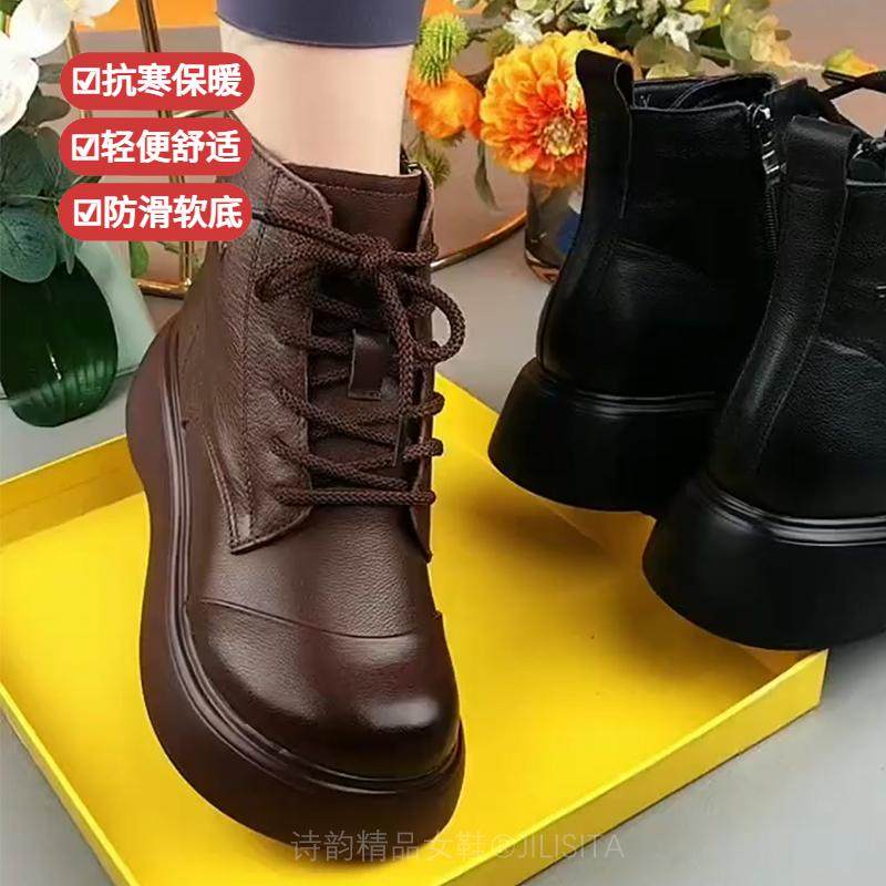 淘真软皮软底马丁靴女2025新款秋冬妈妈鞋冬季加绒加厚复古时尚短靴