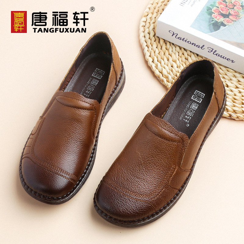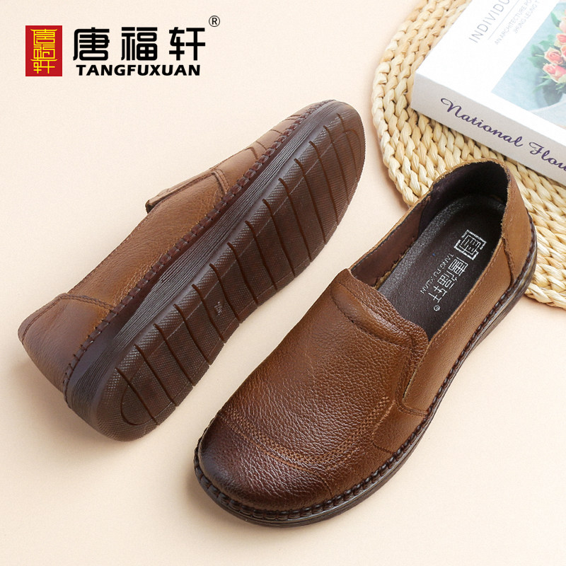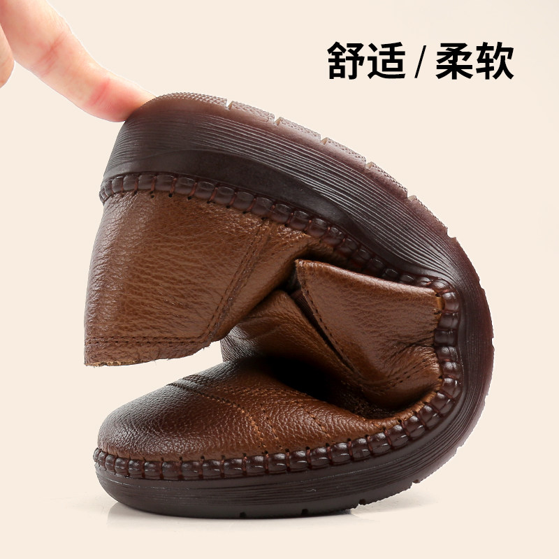 天猫真皮女鞋舒适中老年皮鞋一脚蹬妈妈鞋牛皮单鞋女柔软平底奶奶鞋子