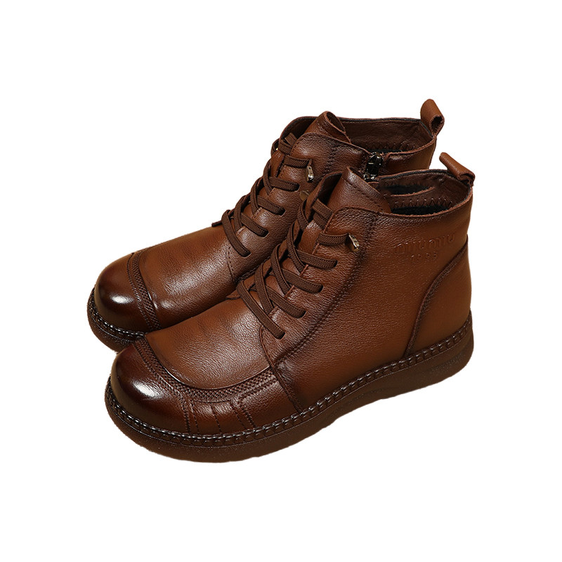 淘宝冬季小短靴女复古真皮平底休闲皮靴软底软面真牛皮中老年妈妈棉靴