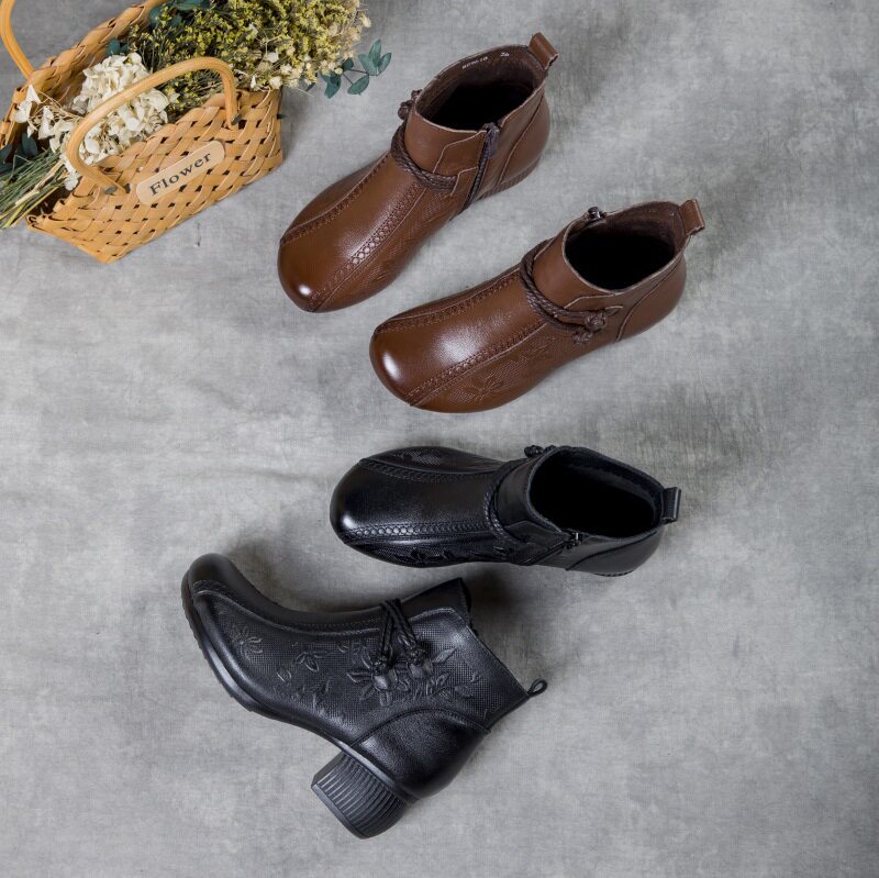 淘宝牛皮中年真皮短靴秋冬棉鞋粗跟舒适防滑妈妈鞋压花复古女鞋圆头