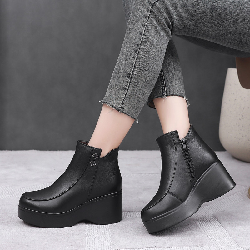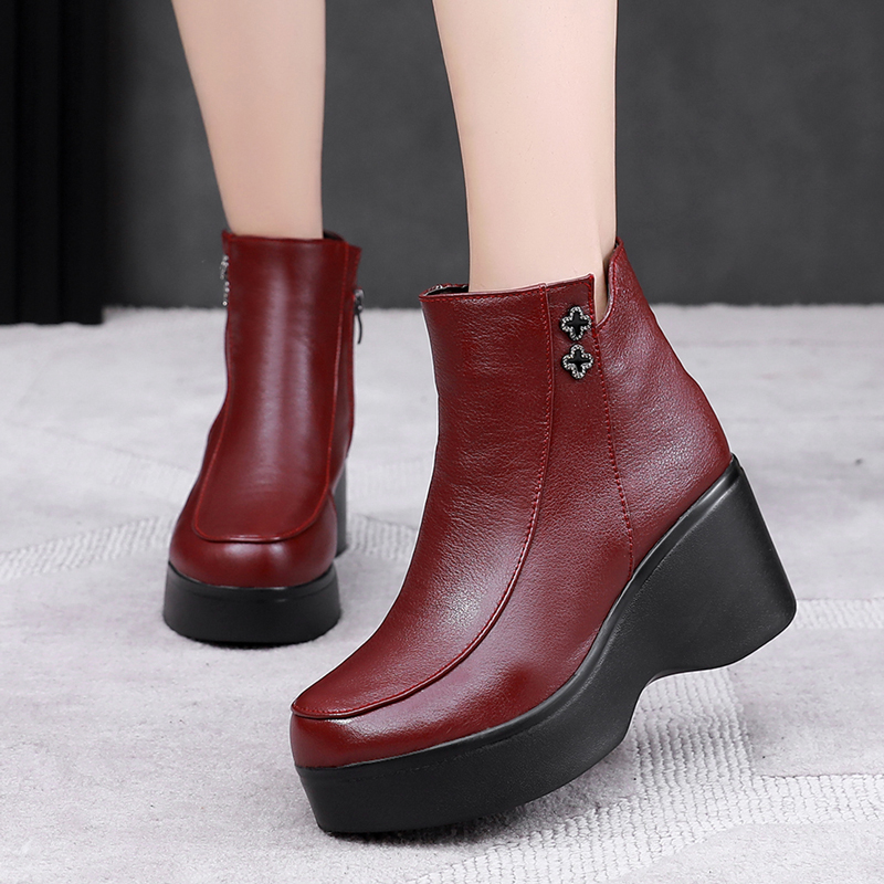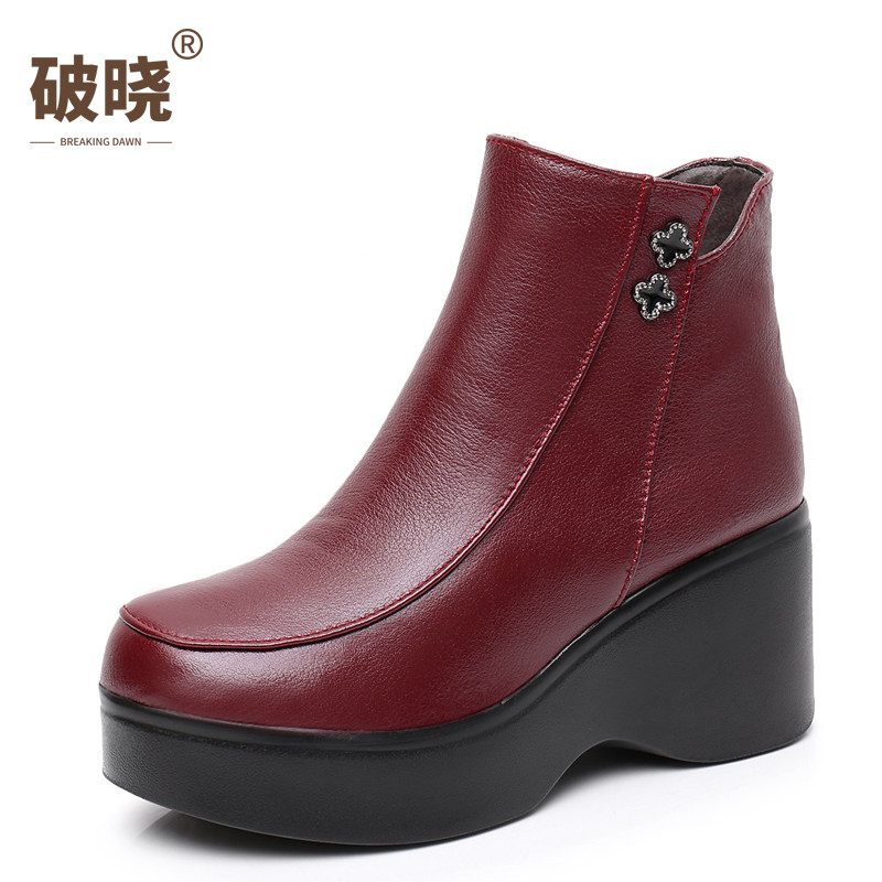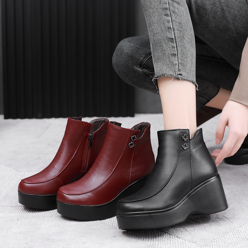 天猫秋冬季女靴红色民族风短靴妈妈棉靴厚底松糕跟坡跟真皮女棉鞋靴子