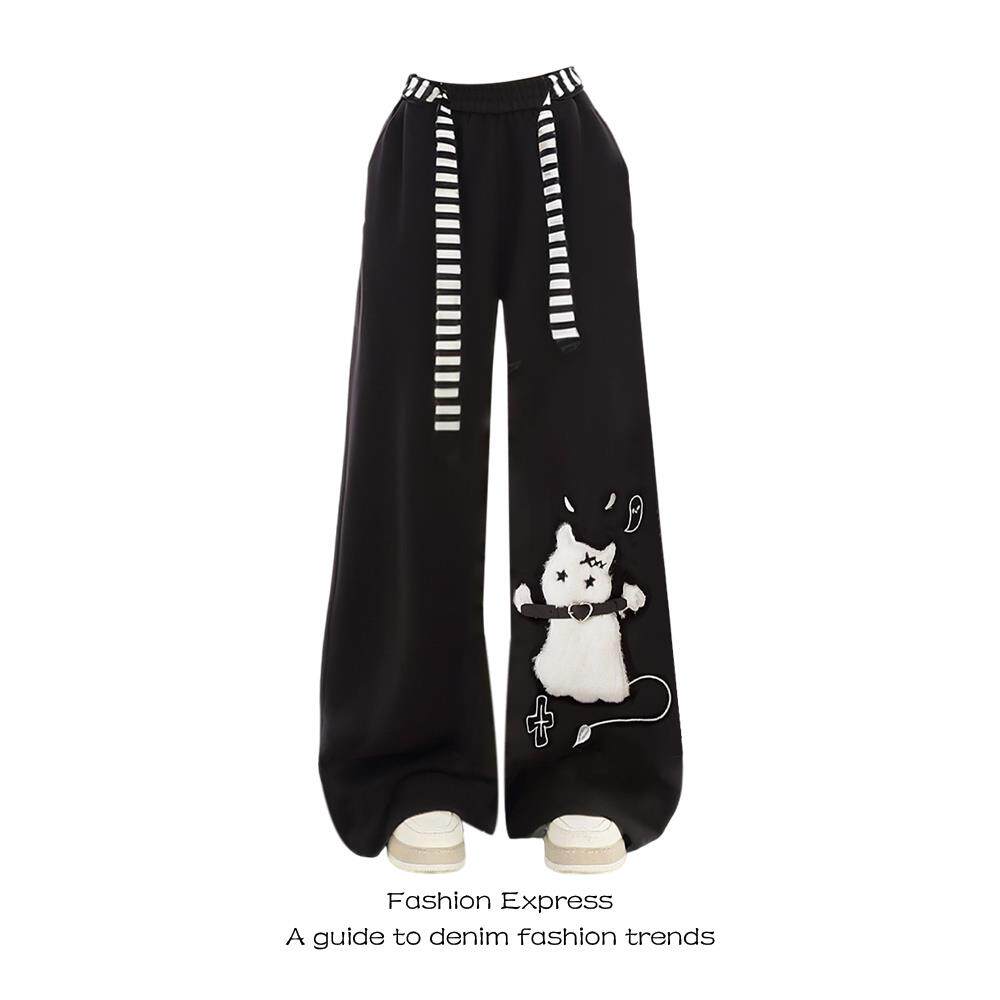 淘宝美式可爱猫咪黑色休闲加绒卫裤子女秋冬季新款亚文化阔腿运动裤女