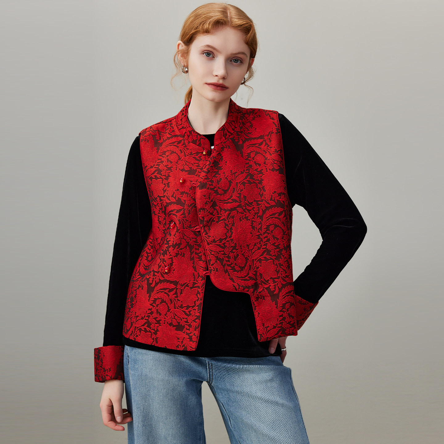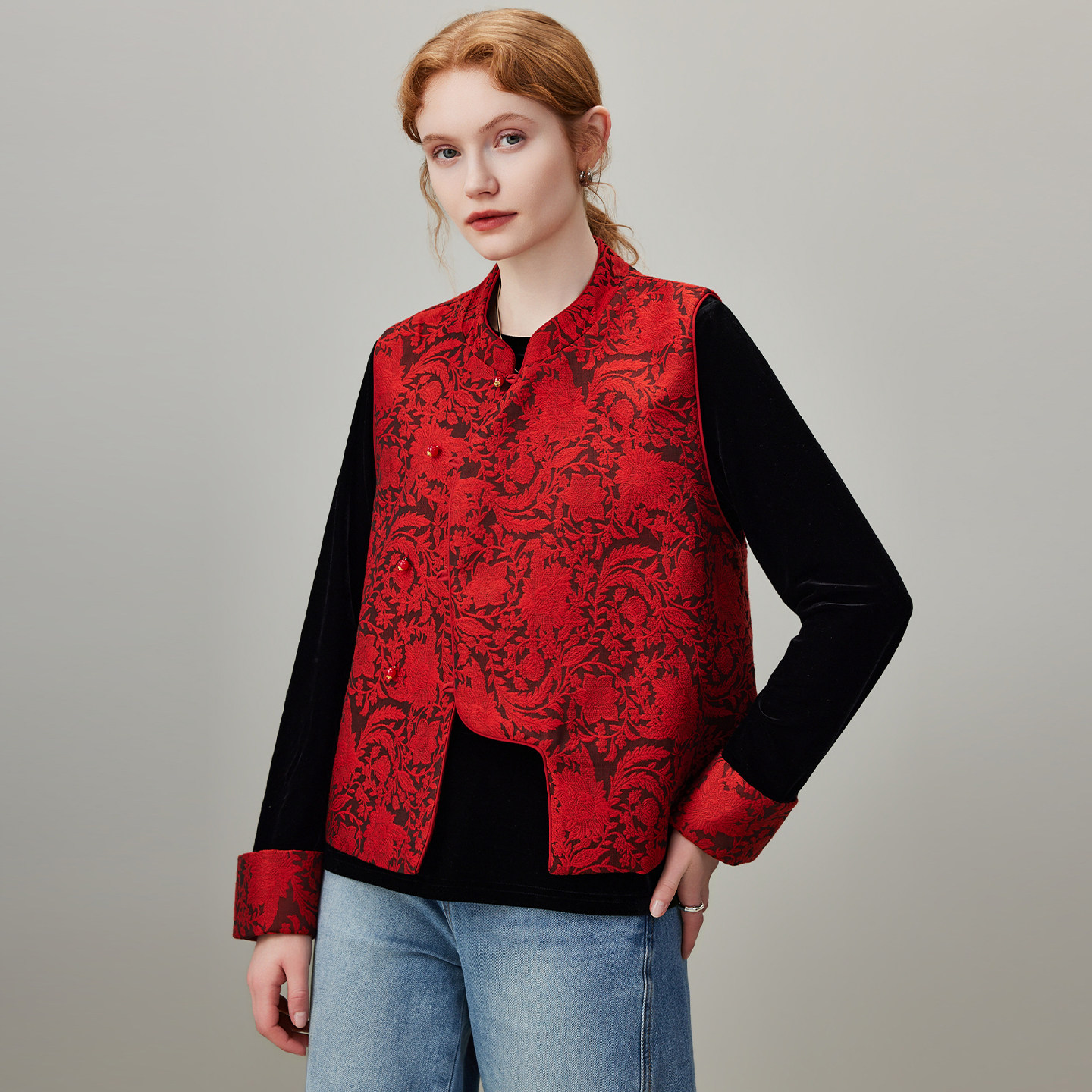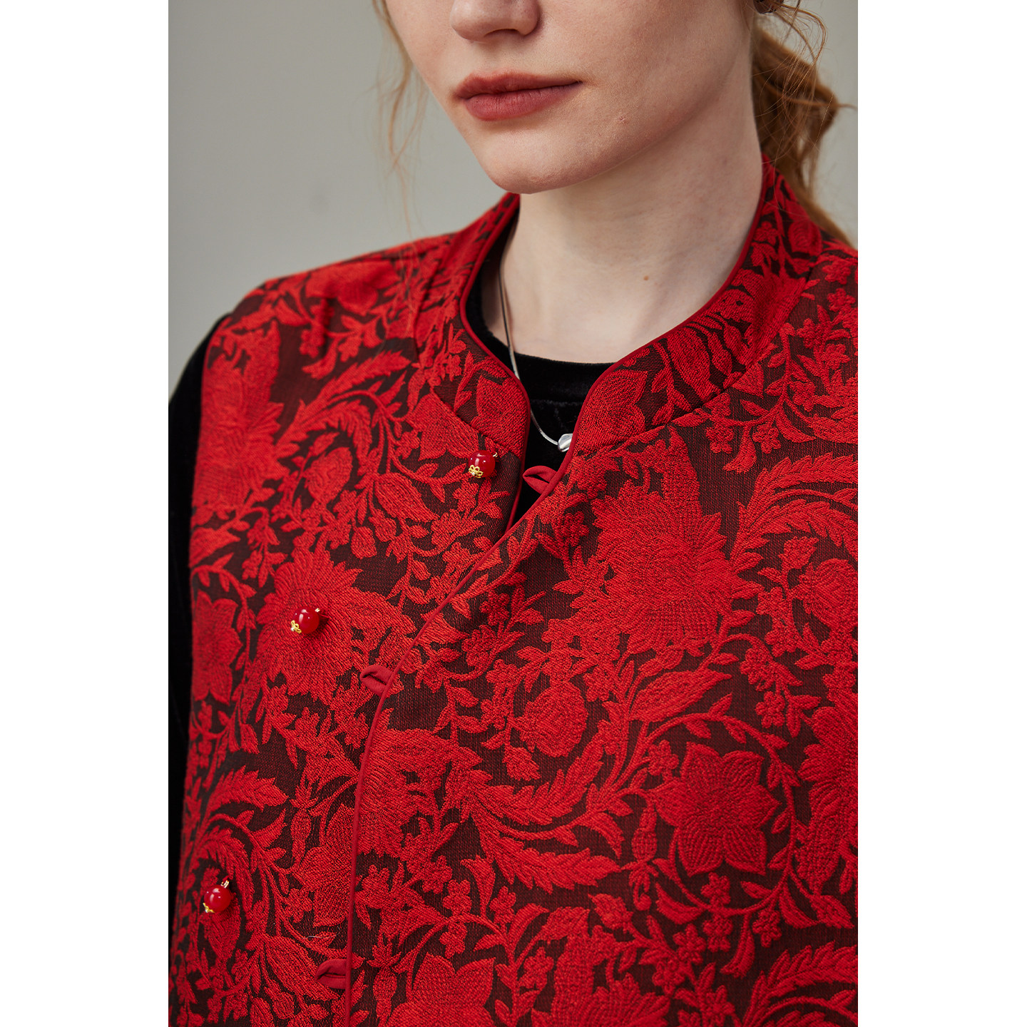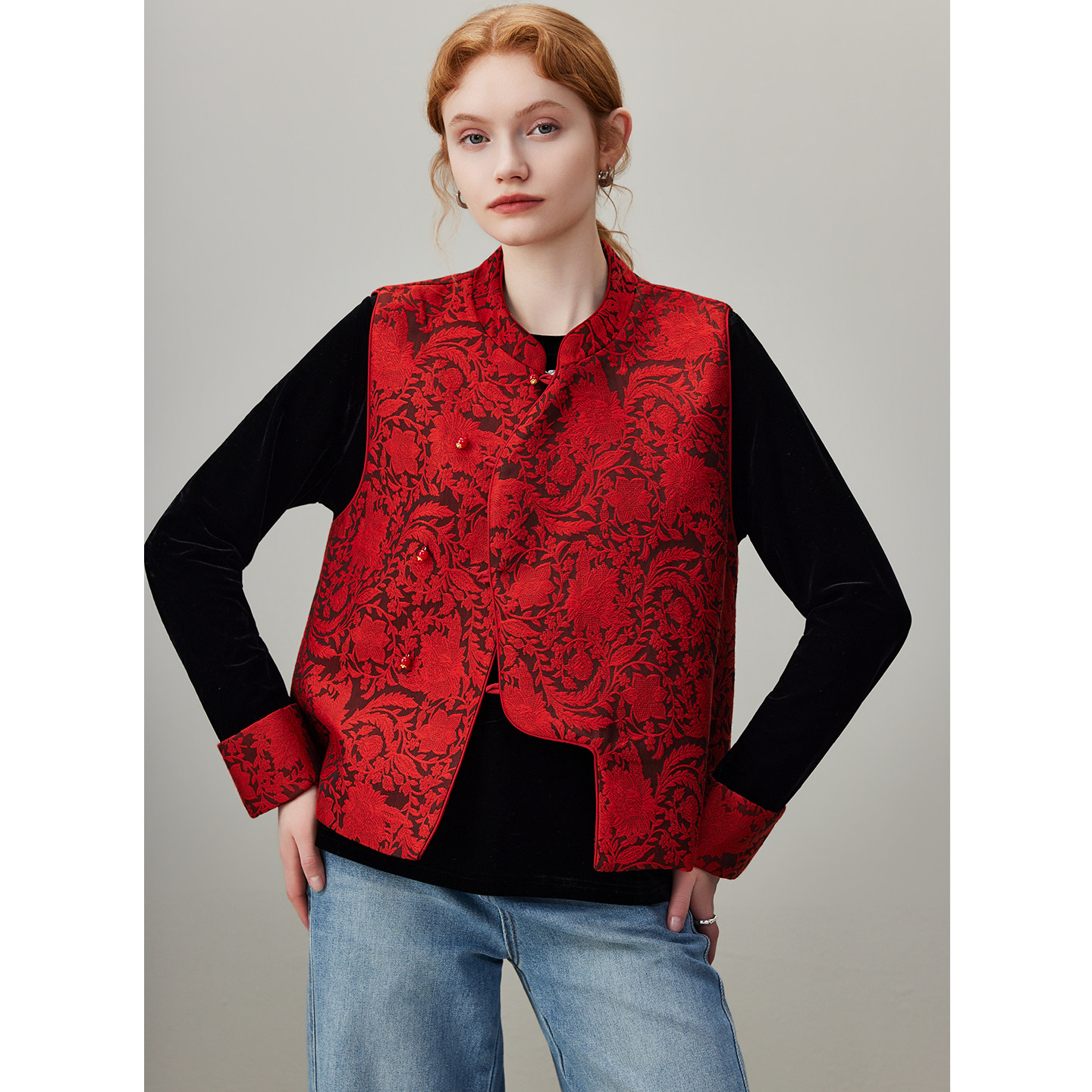 dfvc 2026年春季新款新年红色中式国风绣花马甲,专为小个子女性设计,融合传统与现代美学。采用喜庆正红色调,寓意吉祥如意,精致手工刺绣点缀衣身,展现东方雅致韵味。修身剪裁搭配短款版型,优化身材比例,轻松实现叠穿效果,无论是搭配衬衫、针织衫或连衣裙,都能凸显层次感与时尚度。面料轻盈透气,春季穿着舒适自在。这款背心马甲不仅适合节日穿搭,日常通勤或休闲场合亦能展现独特国风气质,是小个子女生衣橱中不可或缺的时尚单品。