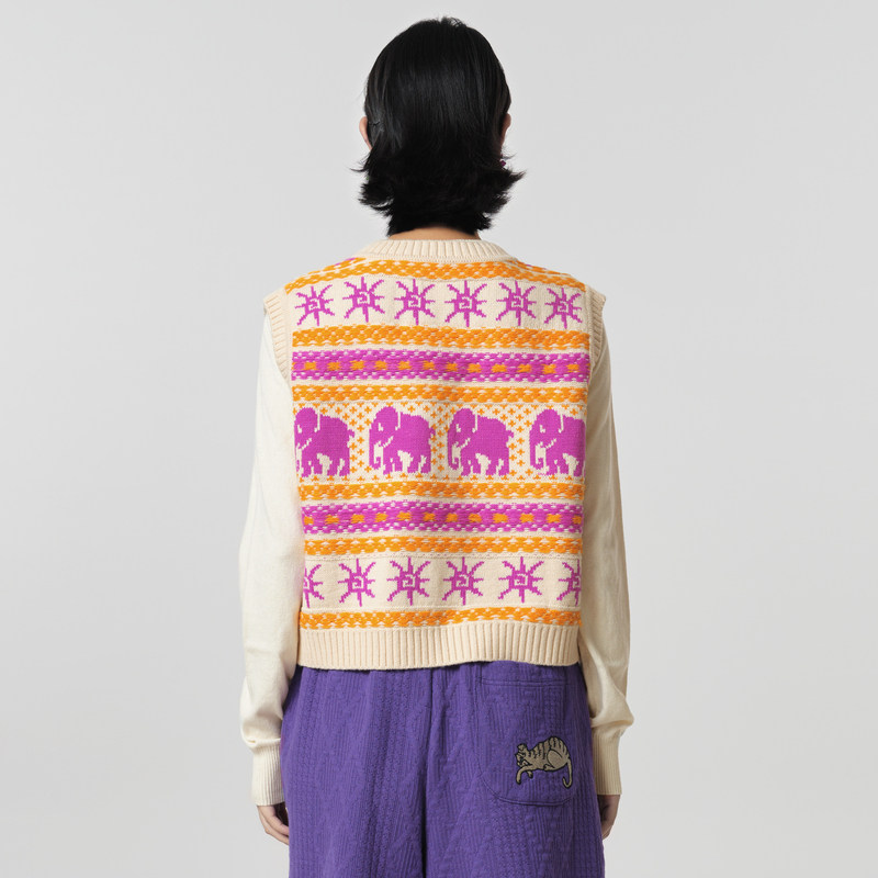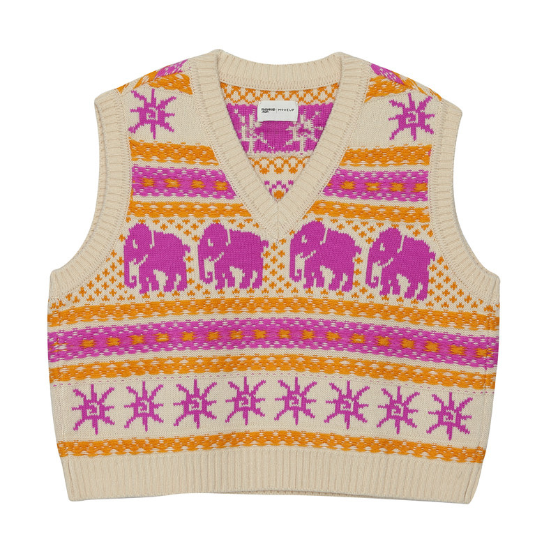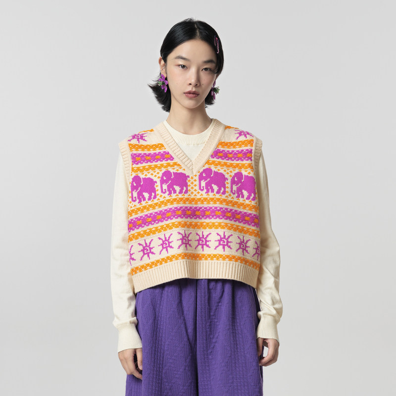 天猫MOVEUP幻走2023冬季新款.FUN系列V领提花组织设计师毛织马夹女