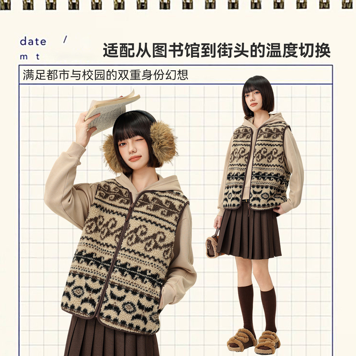 天猫雪中飞2026春新款女士保暖费尔岛羊羔毛马甲圆领重磅百搭外套