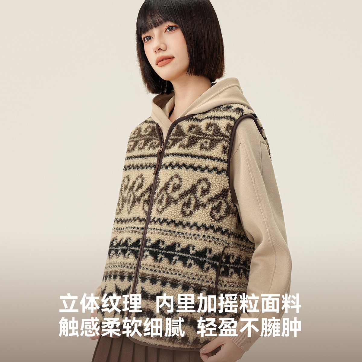 雪中飞2026春新款女士保暖费尔岛羊羔毛马甲,采用高品质重磅羊羔毛面料,触感柔软,保暖性卓越。经典圆领设计简约大方,贴合颈部线条,提升穿着舒适度。费尔岛提花纹理复古雅致,为整体增添时尚层次感。无袖马甲版型轻盈百搭,可轻松叠穿于毛衣、卫衣或外套内,适合早春微凉天气。宽松剪裁包容性强,兼顾舒适与造型感。多色可选,轻松搭配裙装或裤装,打造休闲、通勤或户外多种风格。兼具保暖性与时尚感,是春季衣橱不可或缺的实用单品。