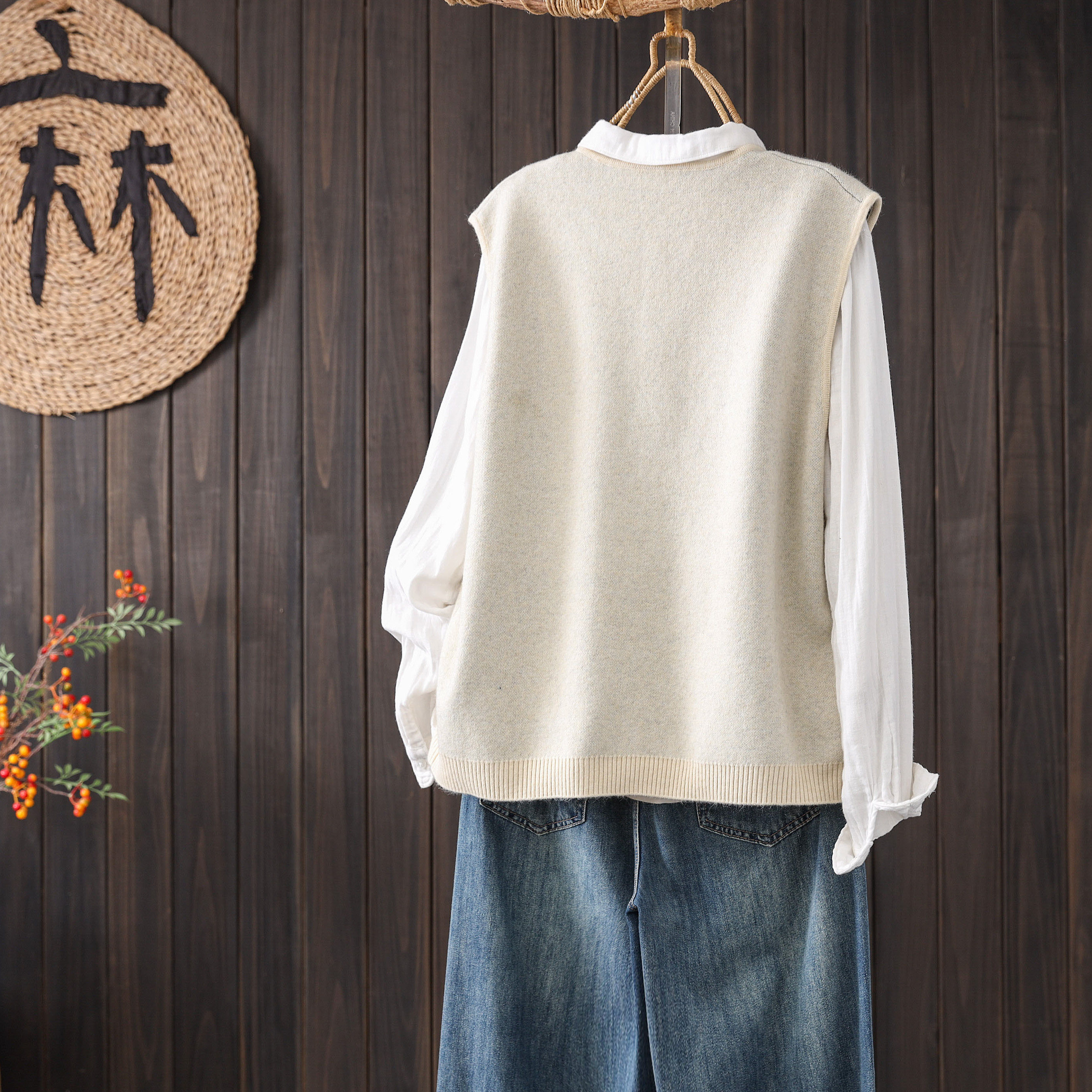 2025秋季新款刺绣棉线马甲外套针织衫女宽松时尚无袖V领文艺复古