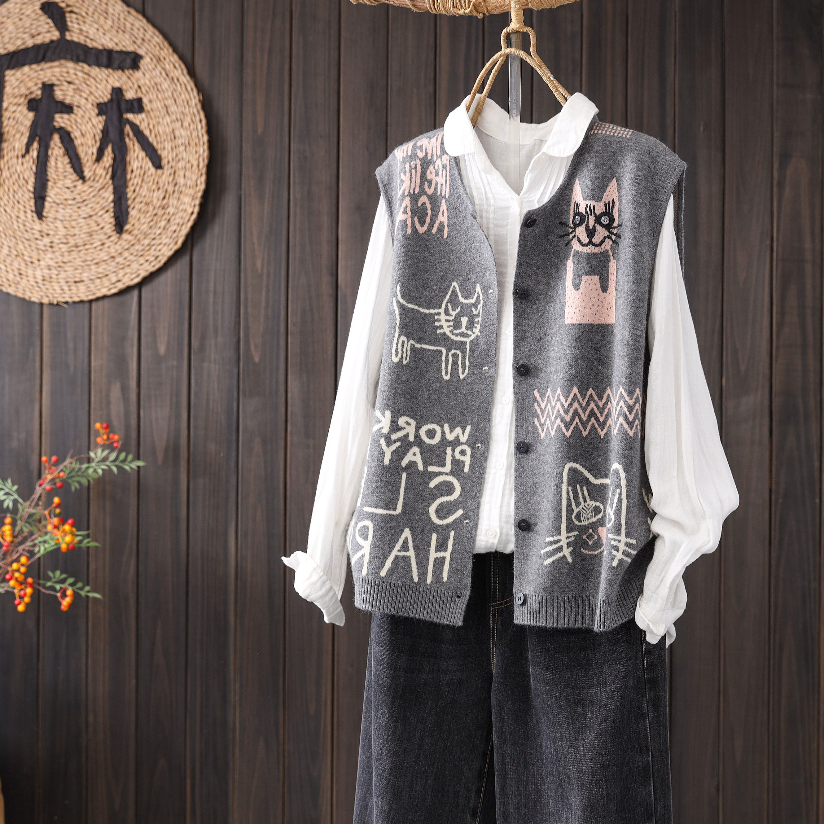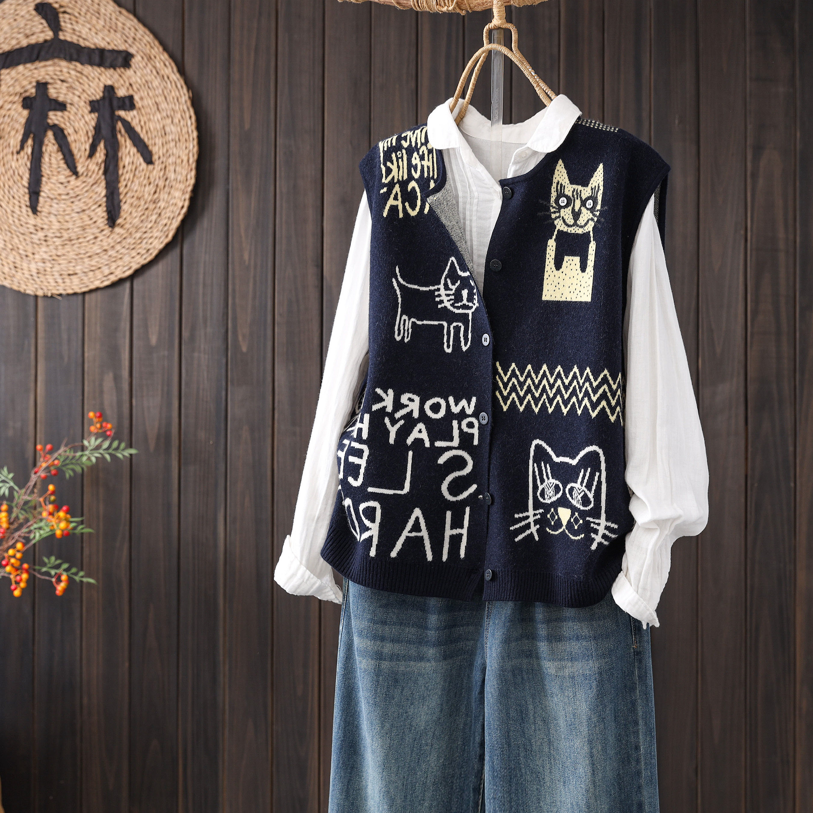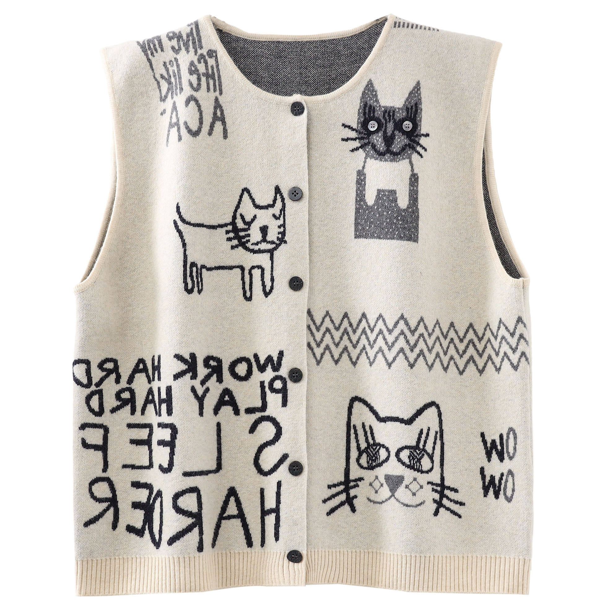 淘宝2025秋季新款卡通小猫涂鸦复古无袖单排扣外搭针织马甲开衫外套女