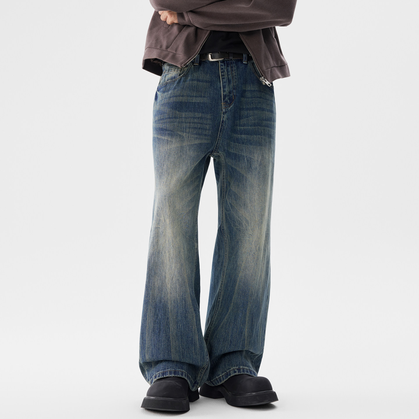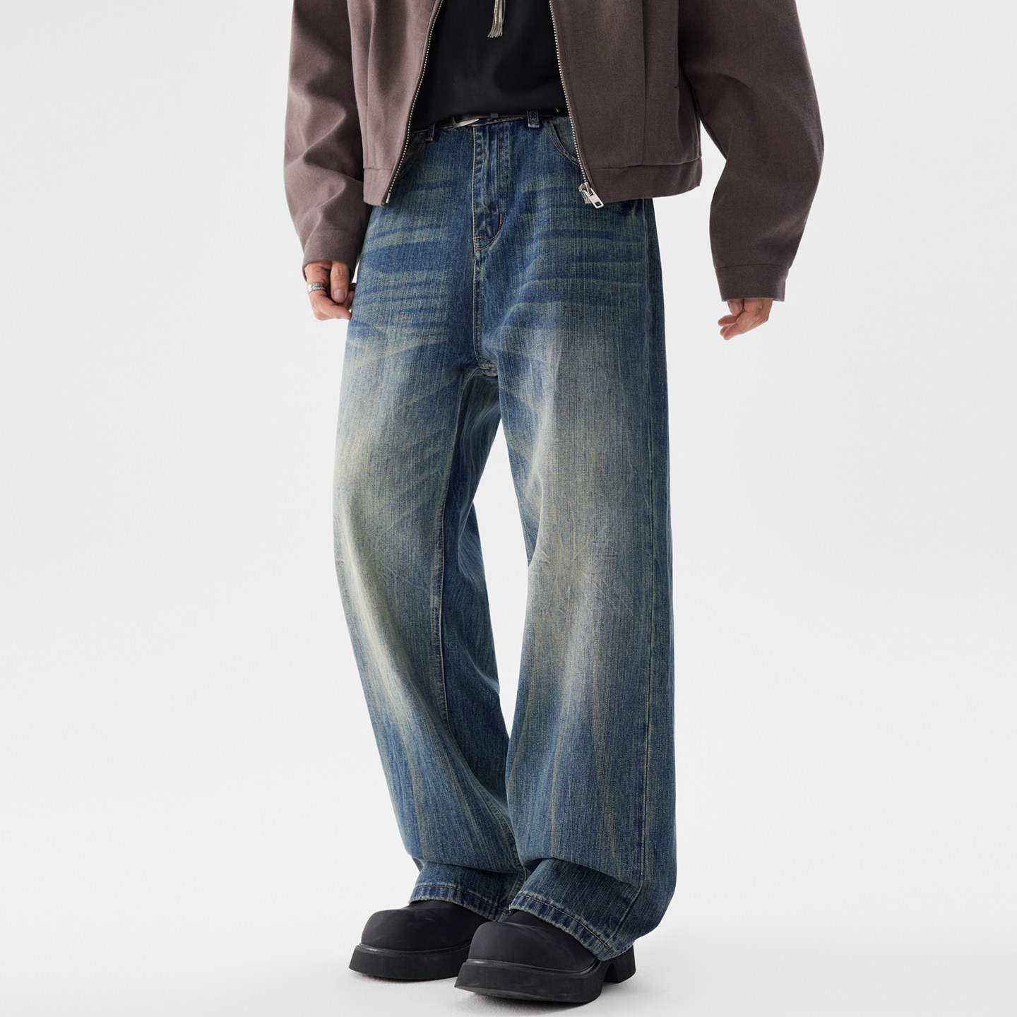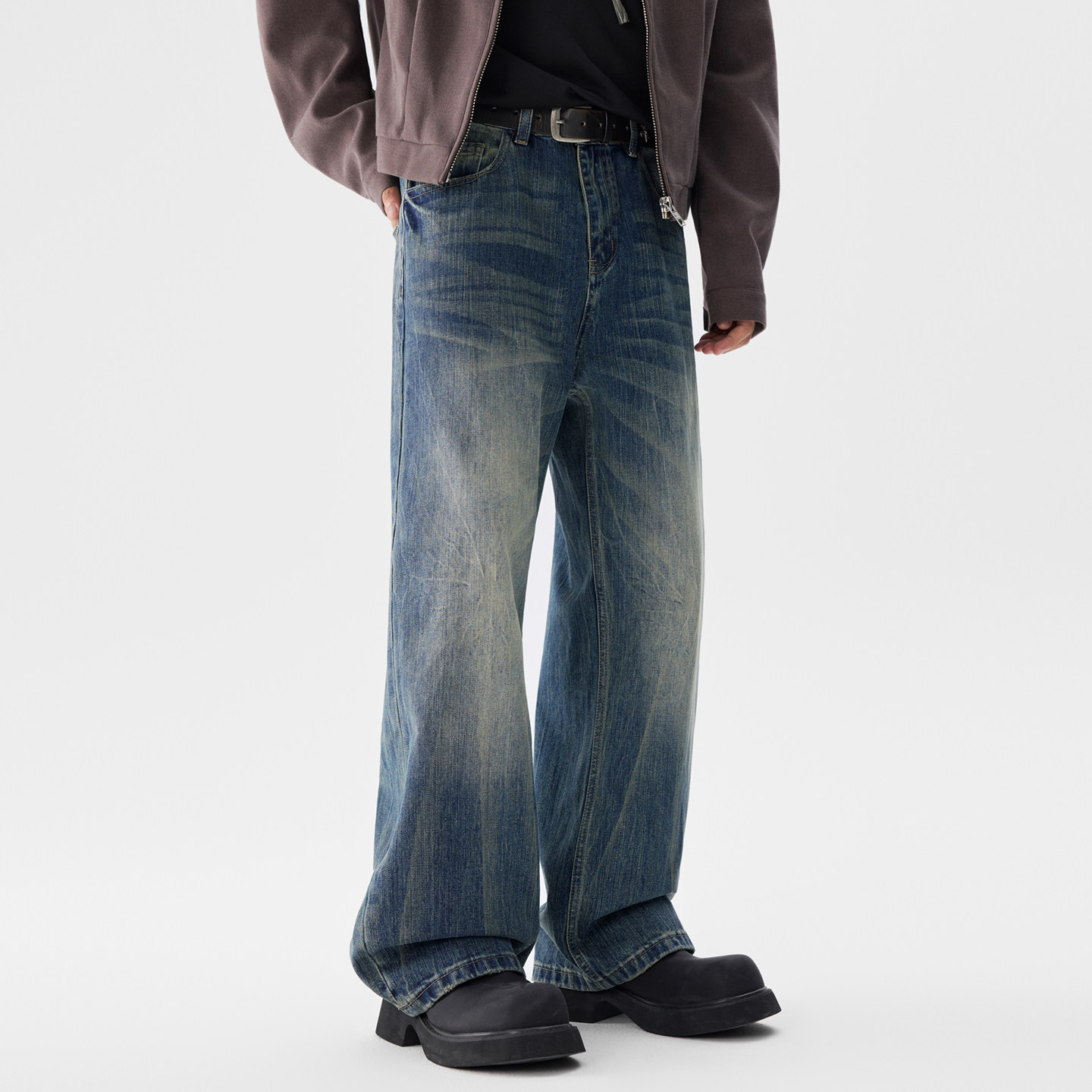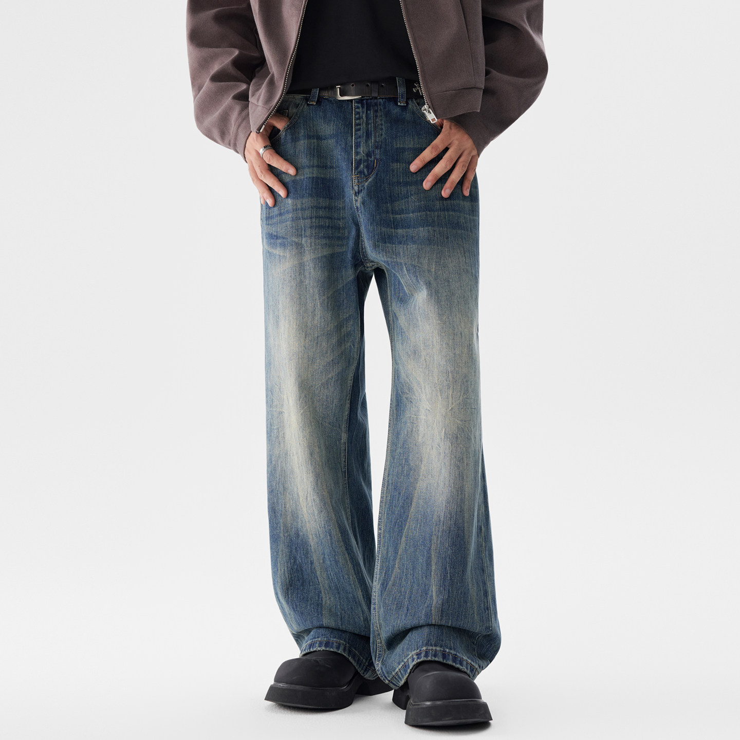 美式复古重水洗做旧牛仔裤男日系宽松直筒外单阔腿拖地老爹长裤男