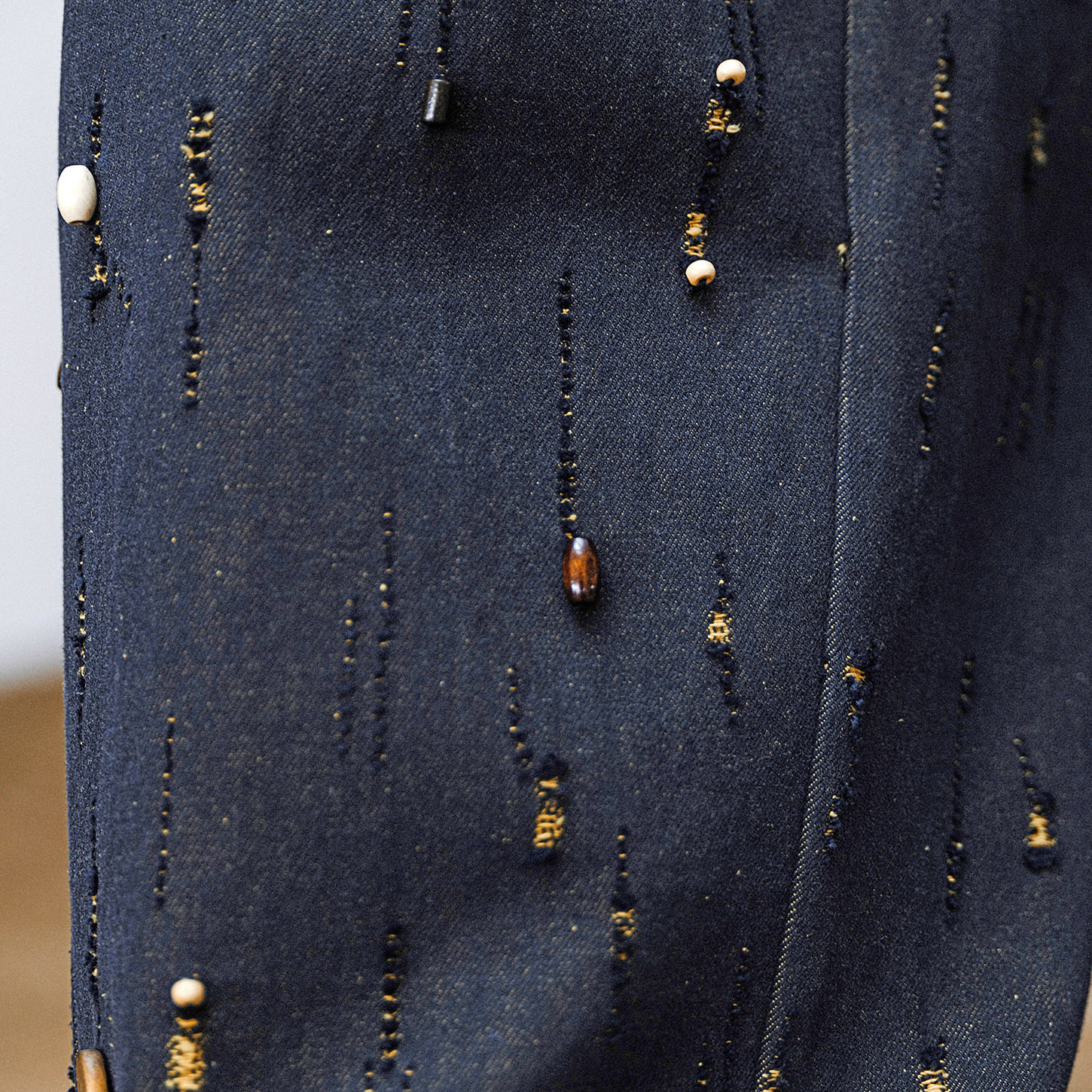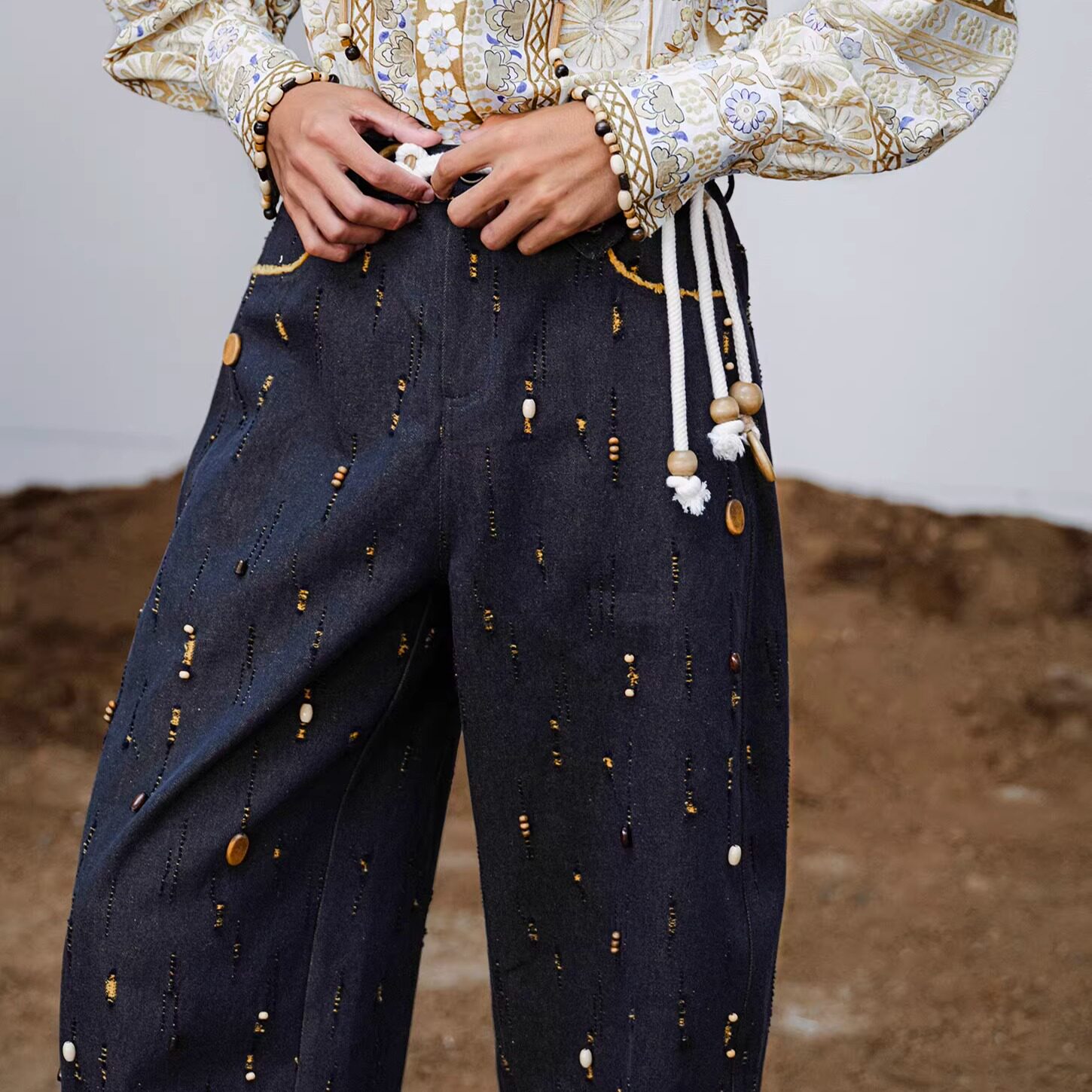 日琢手工木珠复古水洗破洞宽松廓形牛仔裤,源自“山谷少年”原创男装设计,融合自然质朴与都市潮流。采用高品质棉质丹宁面料,经复古水洗工艺处理,呈现自然褪色与岁月质感。裤身点缀手工打磨的天然木珠装饰,细节独特,彰显匠心。宽松廓形剪裁舒适自在,破洞设计恰到好处,兼顾个性与实穿性。整体风格粗犷而不失文艺,灵感源于山野少年的自由灵魂,适合追求质感与态度的现代男性,在日常穿搭中展现不羁而内敛的独特气质。