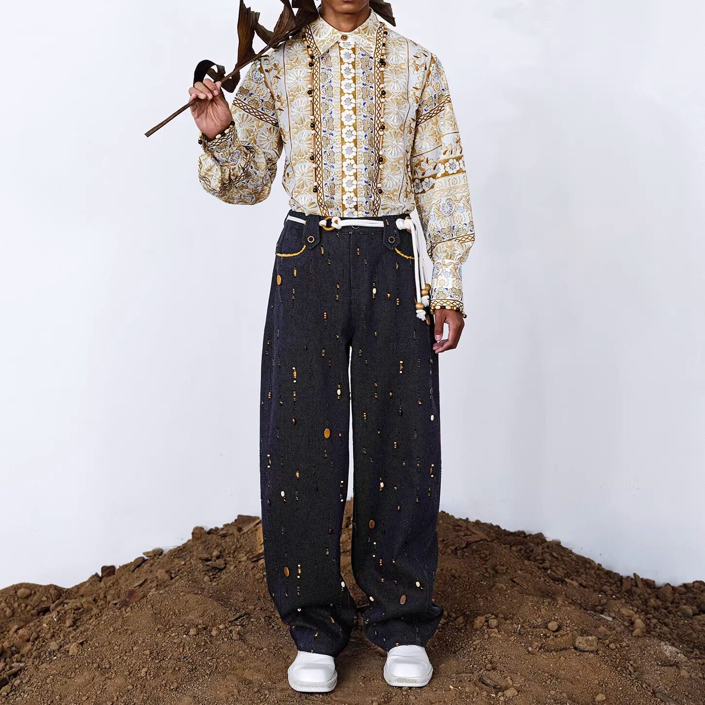 淘宝日琢 手工木珠复古水洗破洞宽松廓形牛仔裤 山谷少年原创设计男装