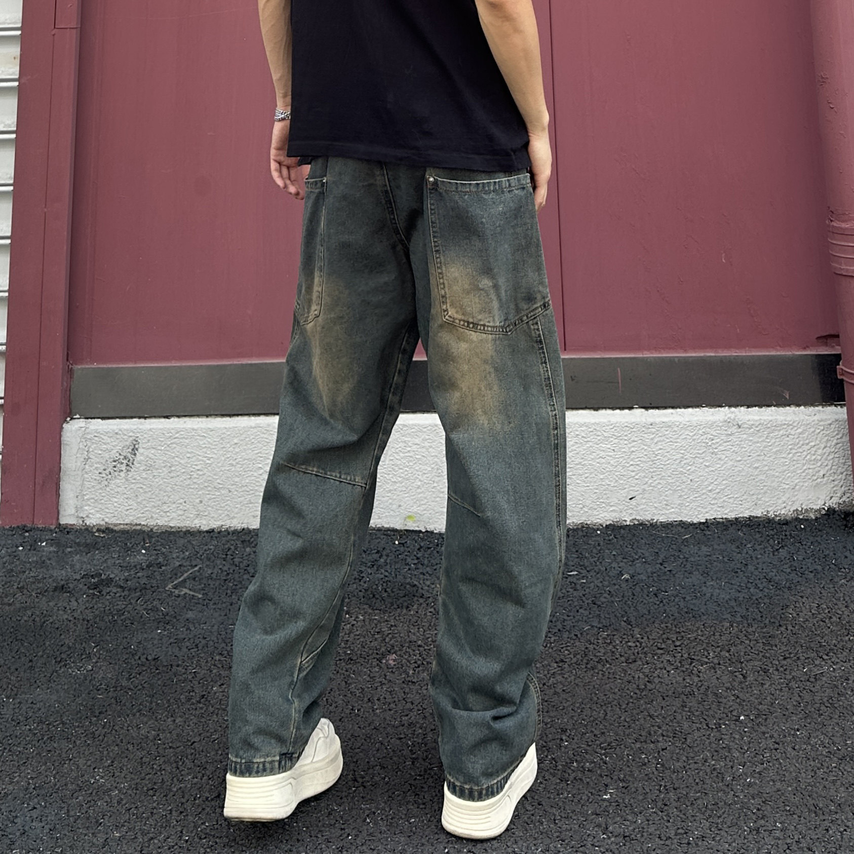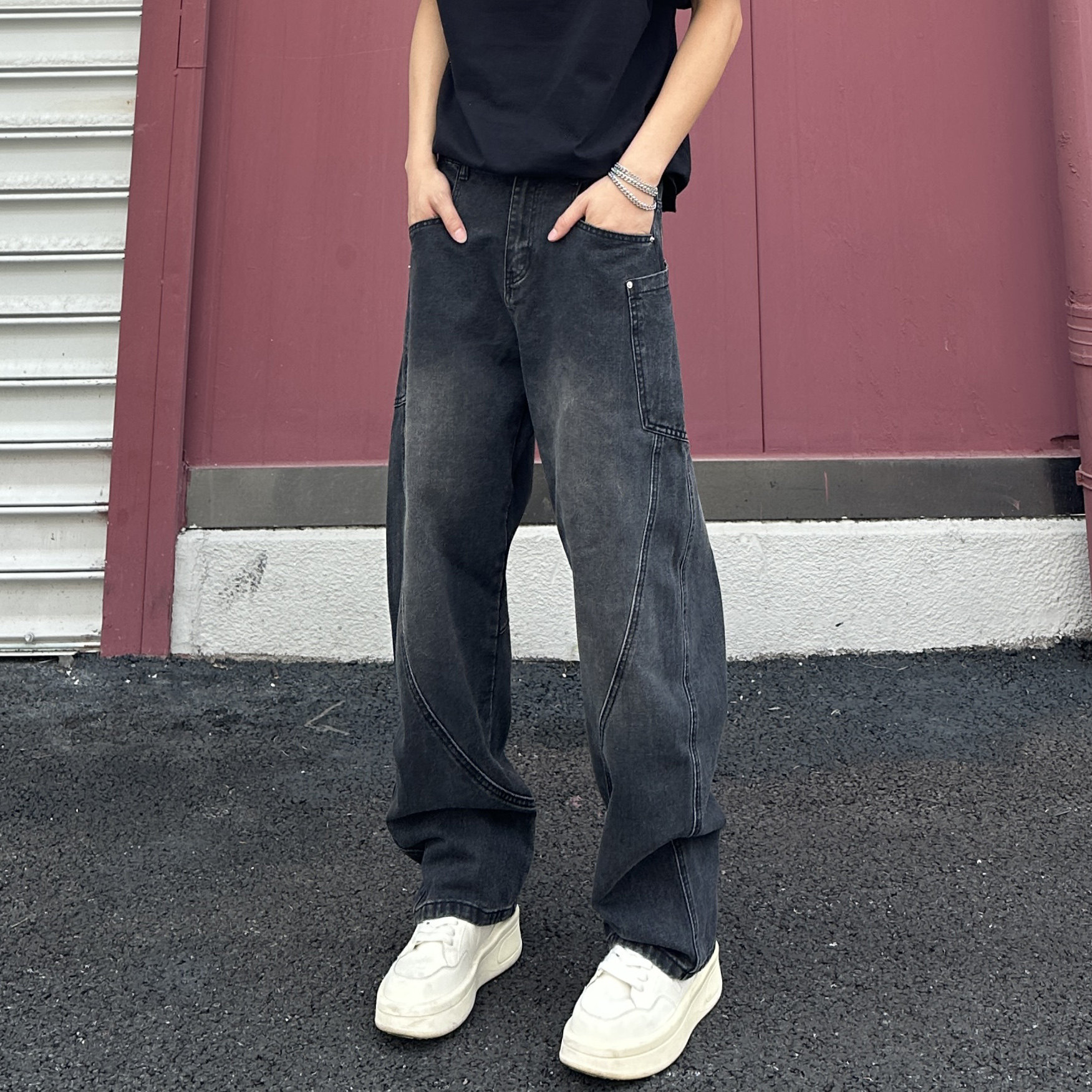 日系复古水洗做旧弯刀立体裁剪牛仔裤男女休闲百搭直筒阔腿长裤潮