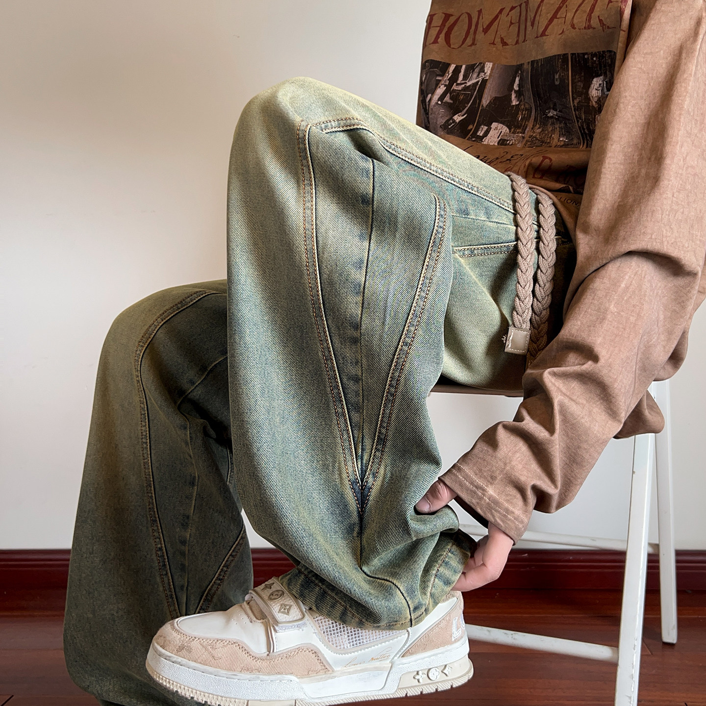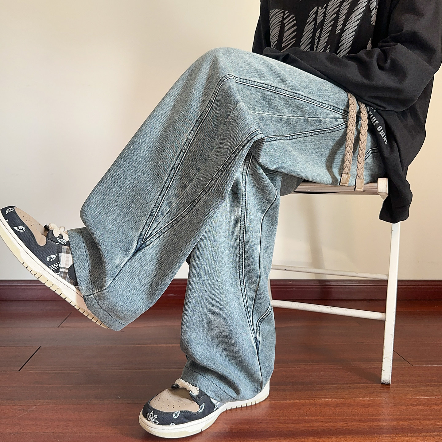 日系复古水洗做旧弯刀立体裁剪牛仔裤男女休闲百搭直筒阔腿长裤潮