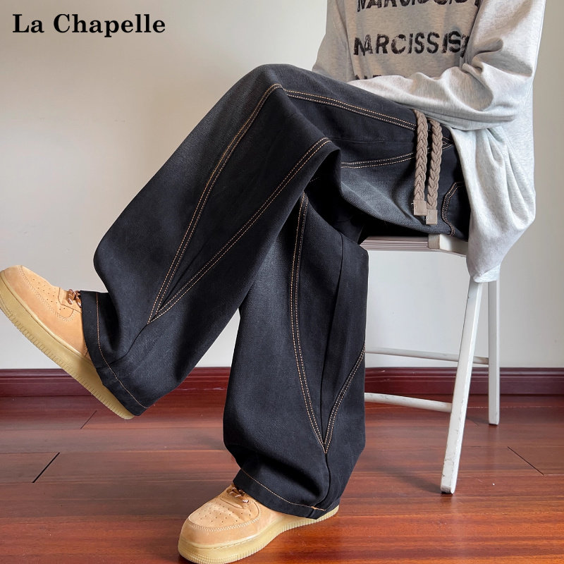 淘宝拉夏贝尔美式加绒牛仔裤秋冬季男女新款vibe宽松水洗弯刀阔腿裤潮