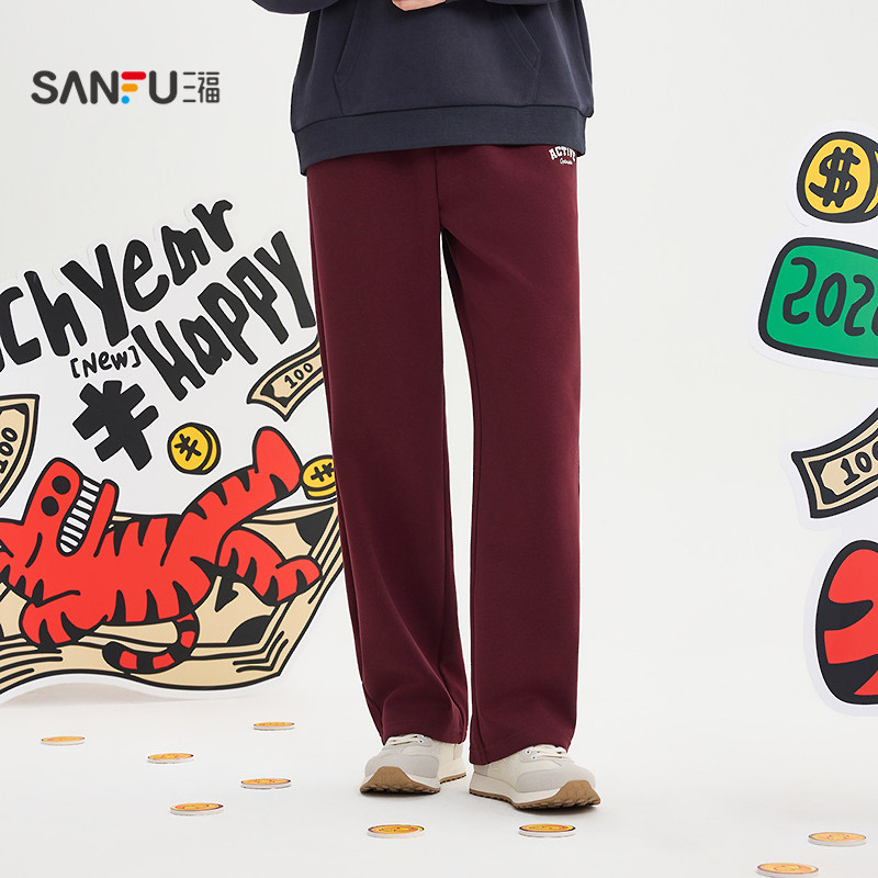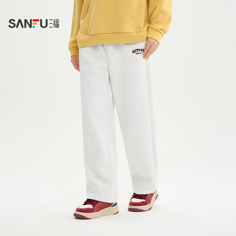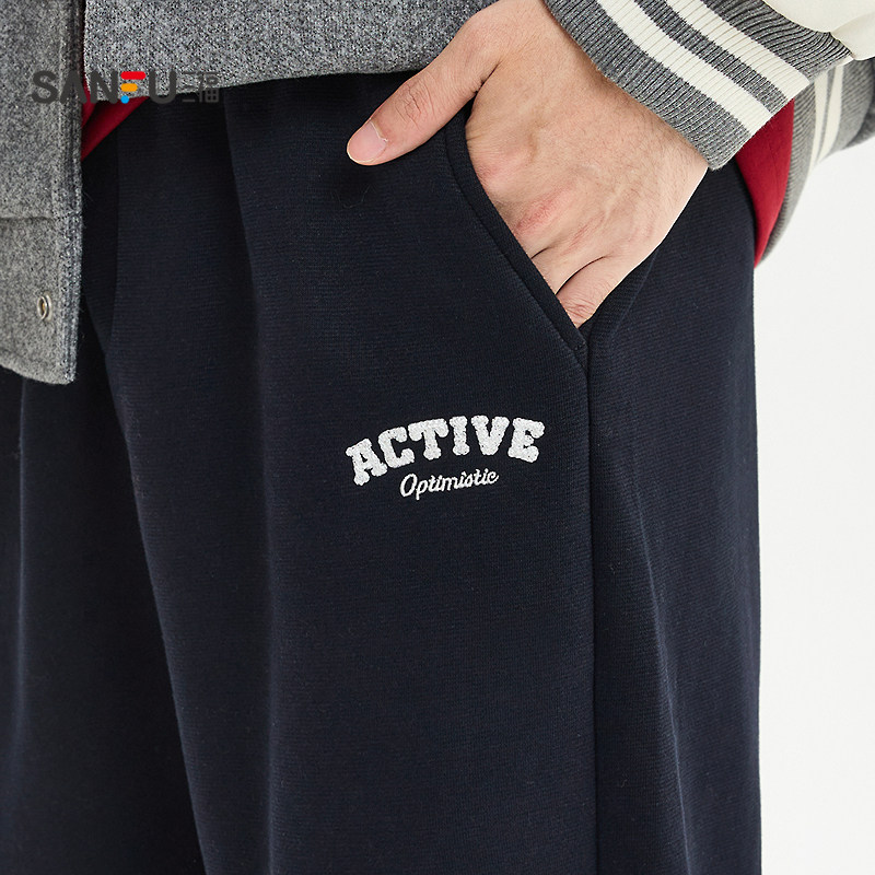 天猫三福2026春季男士英文刺绣针织休闲裤 宽松直筒撞边长裤515669