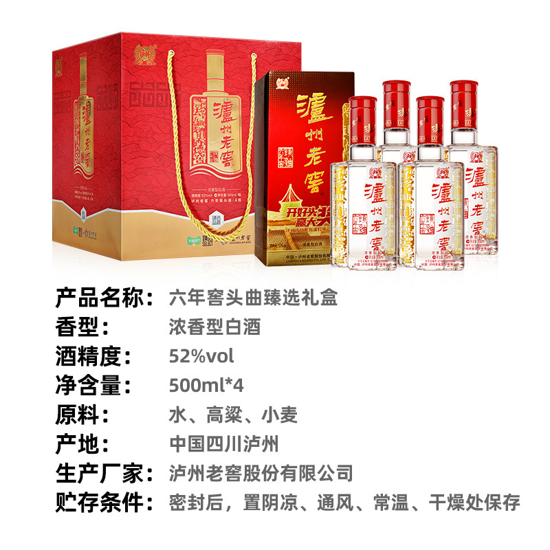 天猫臻选泸州老窖六年窖头曲52度礼盒500ml*4瓶浓香白酒含礼袋