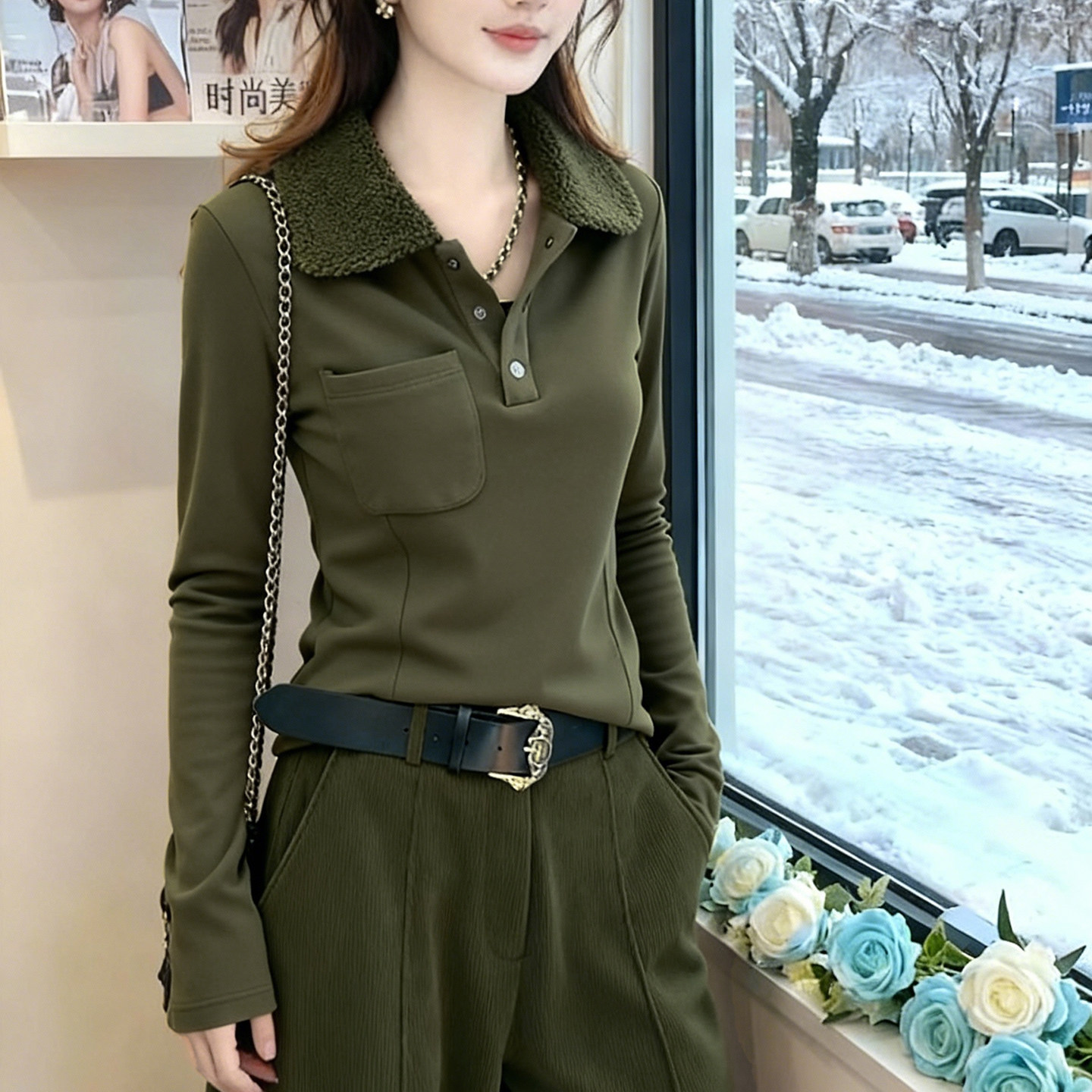 性感纯欲Polo领拼色长袖T恤内搭打底衫女秋季新款修身显瘦上衣