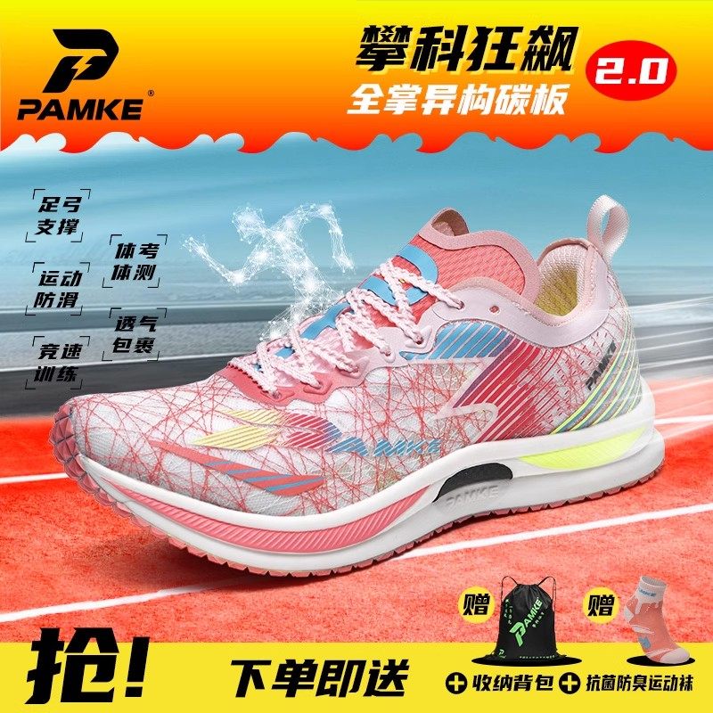 攀科狂飙2.0全掌碳板跑鞋是一款专为田径短跑、跳高、跳远等项目设计的高性能专业跑鞋。搭载全掌碳纤维推进板,有效提升能量回馈与蹬伸效率,助力爆发式加速。中底采用高回弹轻质泡棉,兼具缓震与响应速度,减少能量损耗。鞋面运用透气工程网布,贴合脚型且轻盈透气,增强运动稳定性。前掌上翘设计优化步态过渡,提升跑步经济性。无论是短距离冲刺还是跳跃项目,攀科狂飙2.0都能为运动员提供强劲动力支持,是追求速度突破的专业之选。