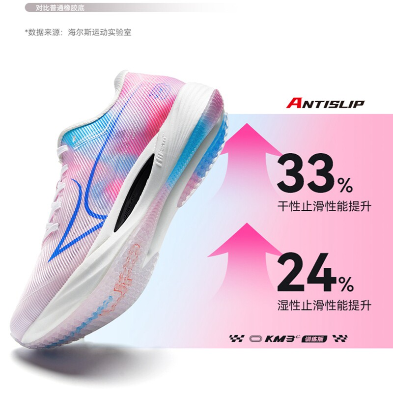 海尔斯KM3C是一款专为中高考体育考试设计的全掌碳板竞速跑鞋,融合跳远、短跑与田径训练多重需求。搭载全掌碳纤维推进板,有效提升能量回弹与步频效率,助力爆发力释放。中底采用高弹轻量泡棉,兼顾缓震与响应速度,减少运动损耗。鞋面使用透气工程网布,贴合脚型且轻盈透气,长时训练更舒适。前掌加宽设计优化起跳稳定性,后跟稳定支撑结构增强落地控制力。无论是立定跳远、50米冲刺或耐力跑,KM3C都能提供精准助力,是考生突破成绩的理想装备。专业科技,为体育应试而生。