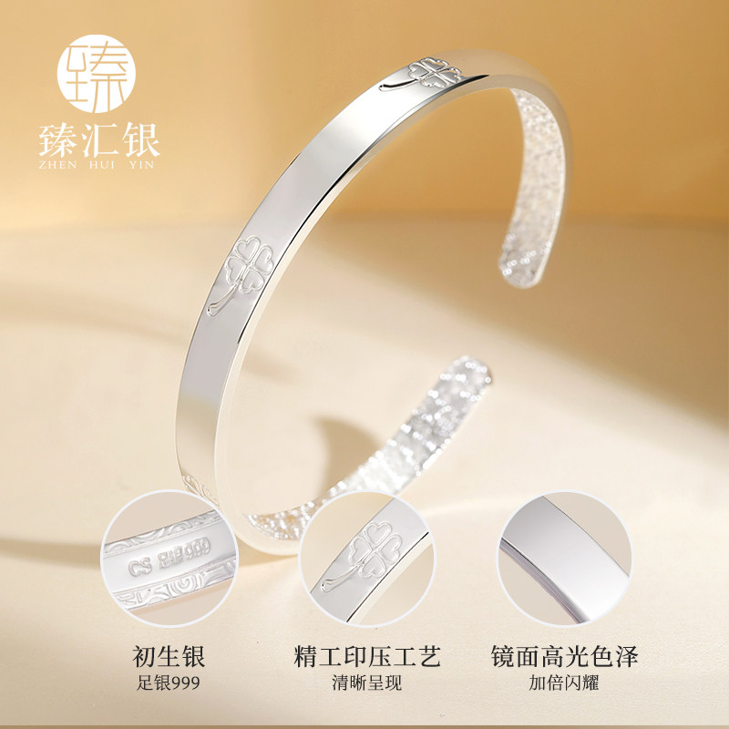 天猫臻汇银999纯银四叶草银手镯女足银钉砂镯子轻奢手饰生日礼物
