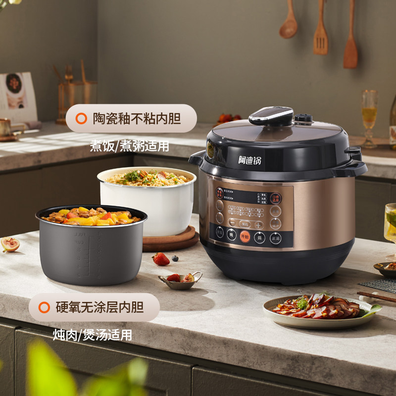 洛贝阿迪锅5L双胆多功能电压力锅,官方正品保障,集智能与高效于一体。配备5升大容量,满足全家需求,双胆设计(不锈钢内胆+铝合金内胆)实现生熟分离或荤素分煮,健康卫生。支持电压力锅、电饭煲、慢炖锅等多种功能,一锅多用。智能预约功能,最长24小时预约,轻松掌控烹饪时间。采用微电脑控制,12大安全保护,使用更安心。快速升压、均匀受热,锁住营养与美味。适用于煮饭、炖汤、焖肉、蒸菜等多种烹饪场景,是厨房的理想助手。简约设计,操作便捷,清洁轻松,为现代家庭带来高效、健康、智能的烹饪体验。
