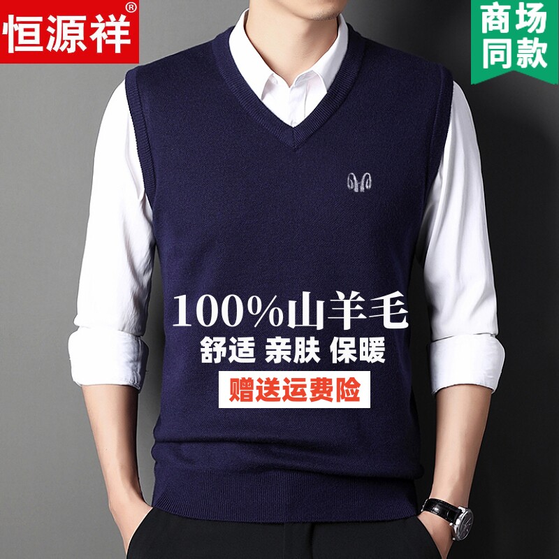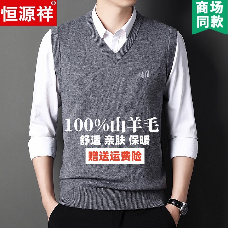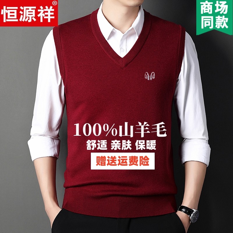 淘宝恒源祥中年男士羊毛背心冬季纯色V领中老年针织坎肩加厚毛衣马甲
