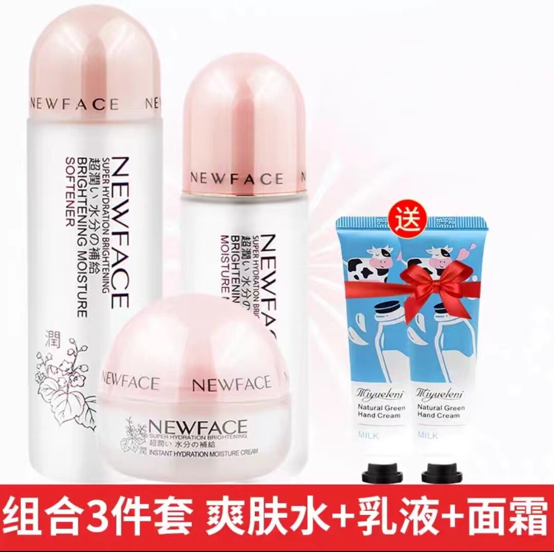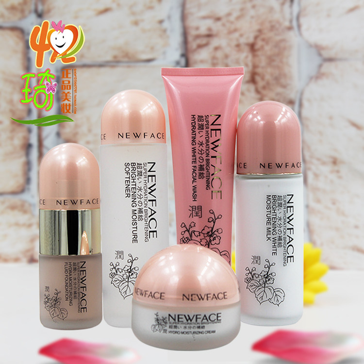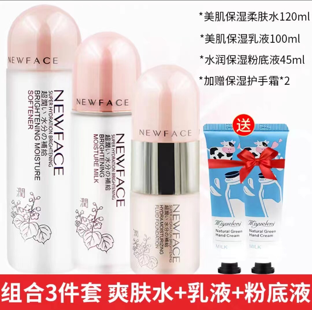 新面孔护肤套装是一款专为日常保湿补水设计的专柜正品护肤组合,包含洁面乳、柔肤水、乳液、面霜及粉底液,五步齐全,满足基础护肤与底妆需求。产品采用温和配方,富含天然保湿因子与植物精华,深层清洁同时锁水滋润,改善肌肤干燥粗糙,令肌肤水润透亮。柔肤水舒缓调理,乳液轻盈易吸收,面霜长效滋养,粉底液贴合肌肤,自然遮瑕不卡粉。适合多种肤质日常使用,尤其适合干燥季节或空调环境。坚持使用,可提升肌肤水润度与光泽感,焕发健康光彩。新面孔品牌专注护肤品质,专柜正品保障,安心之选。