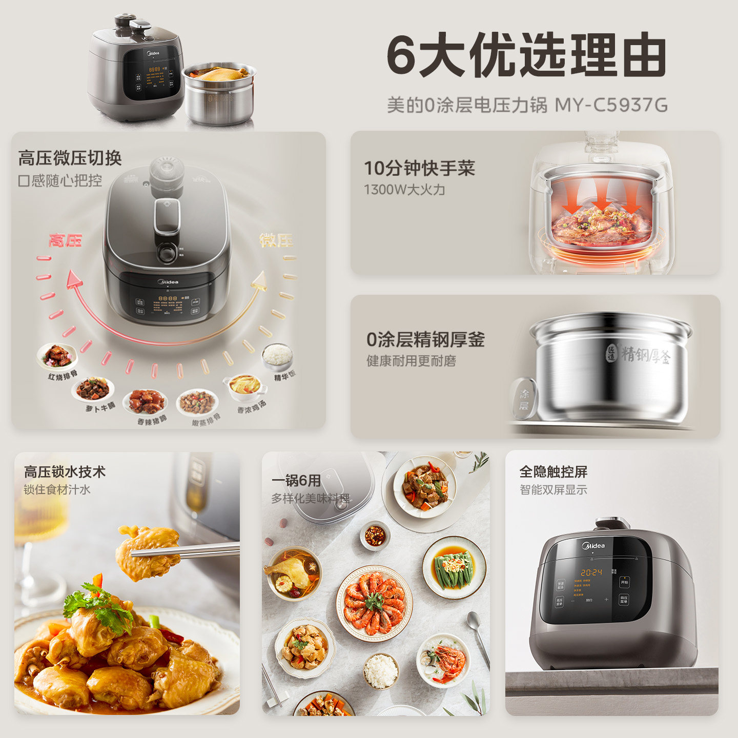 天美的0涂层电压力锅家用大容量0氟双胆智能多功能高压锅6L高压饭煲