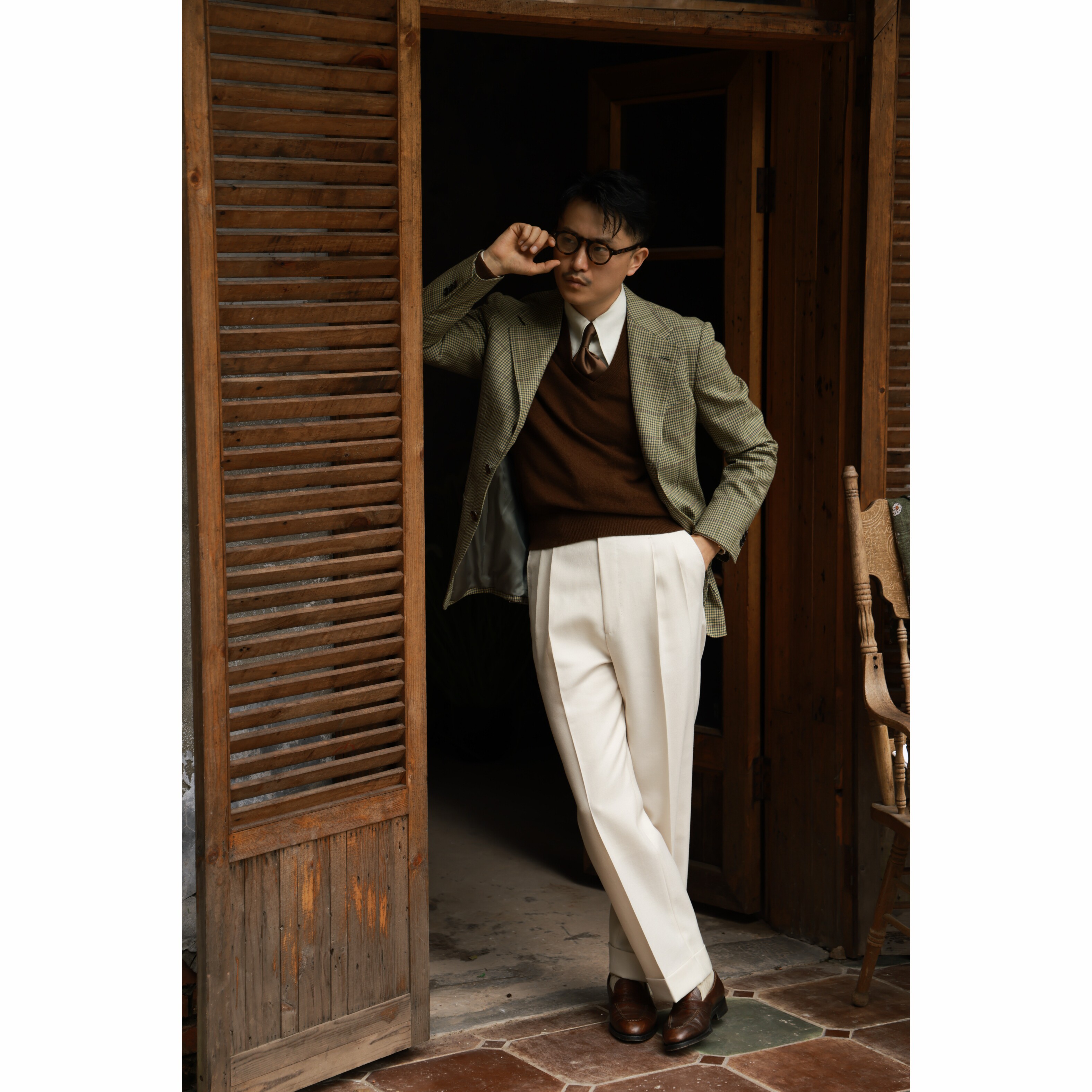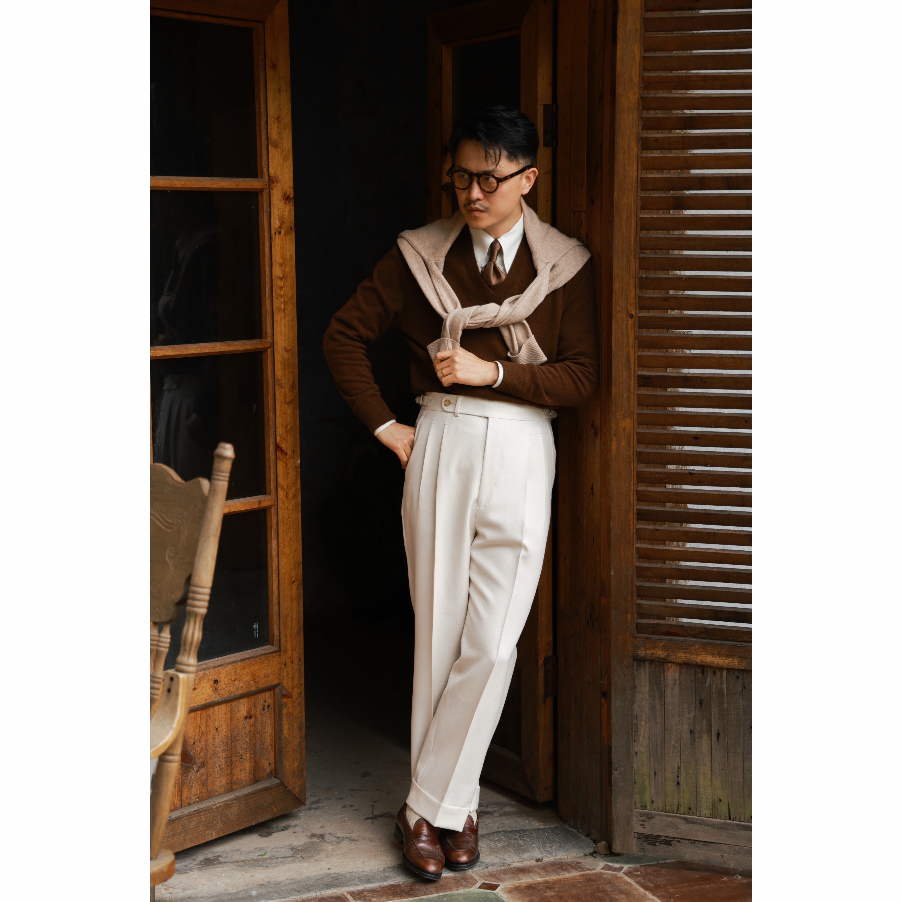 淘【100%羊毛粗花呢】CULTUM意式那不勒斯人字纹双褶高腰休闲西裤男