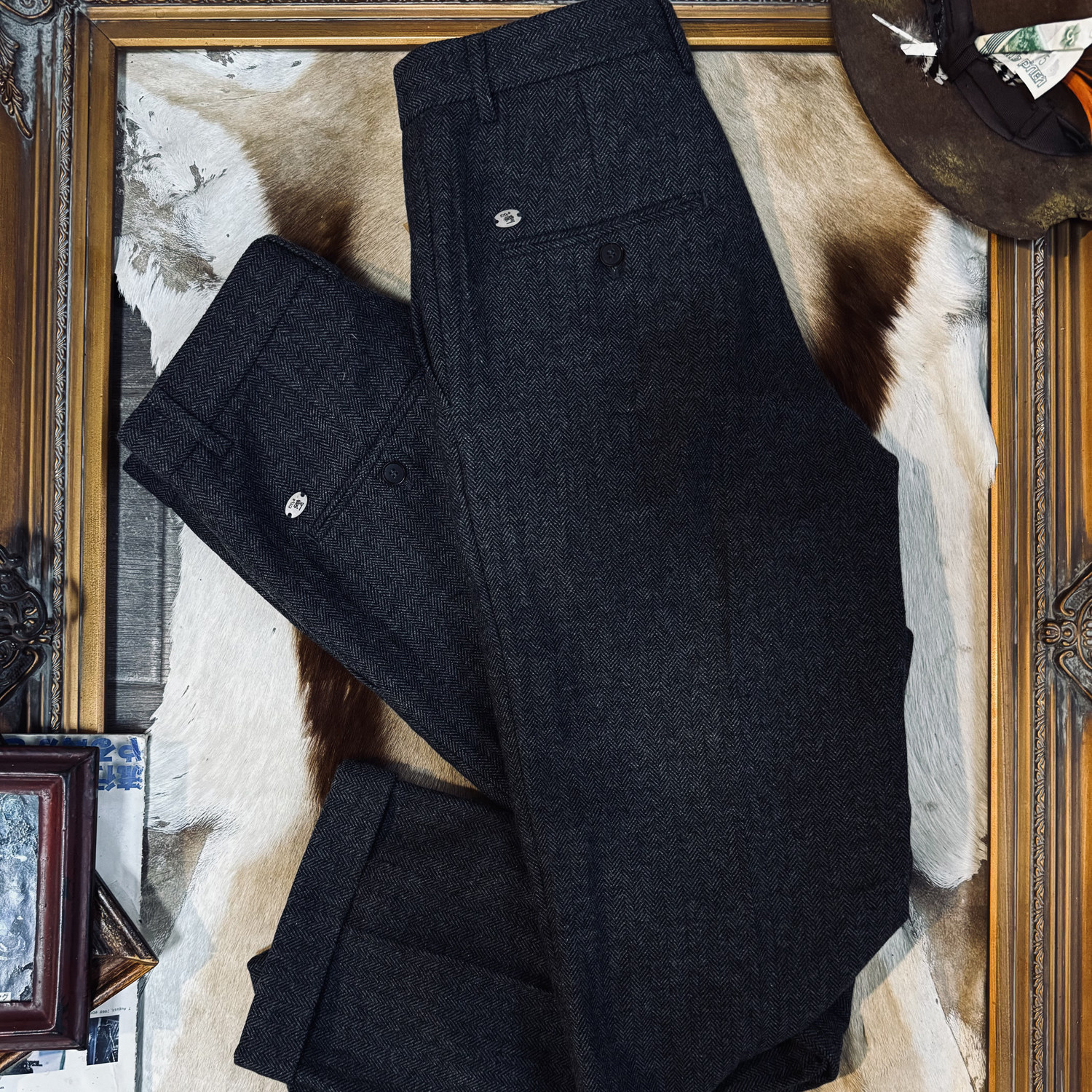 淘宝美式复古人字纹粗花呢中高腰微锥型九分西裤羊毛长裤男休闲