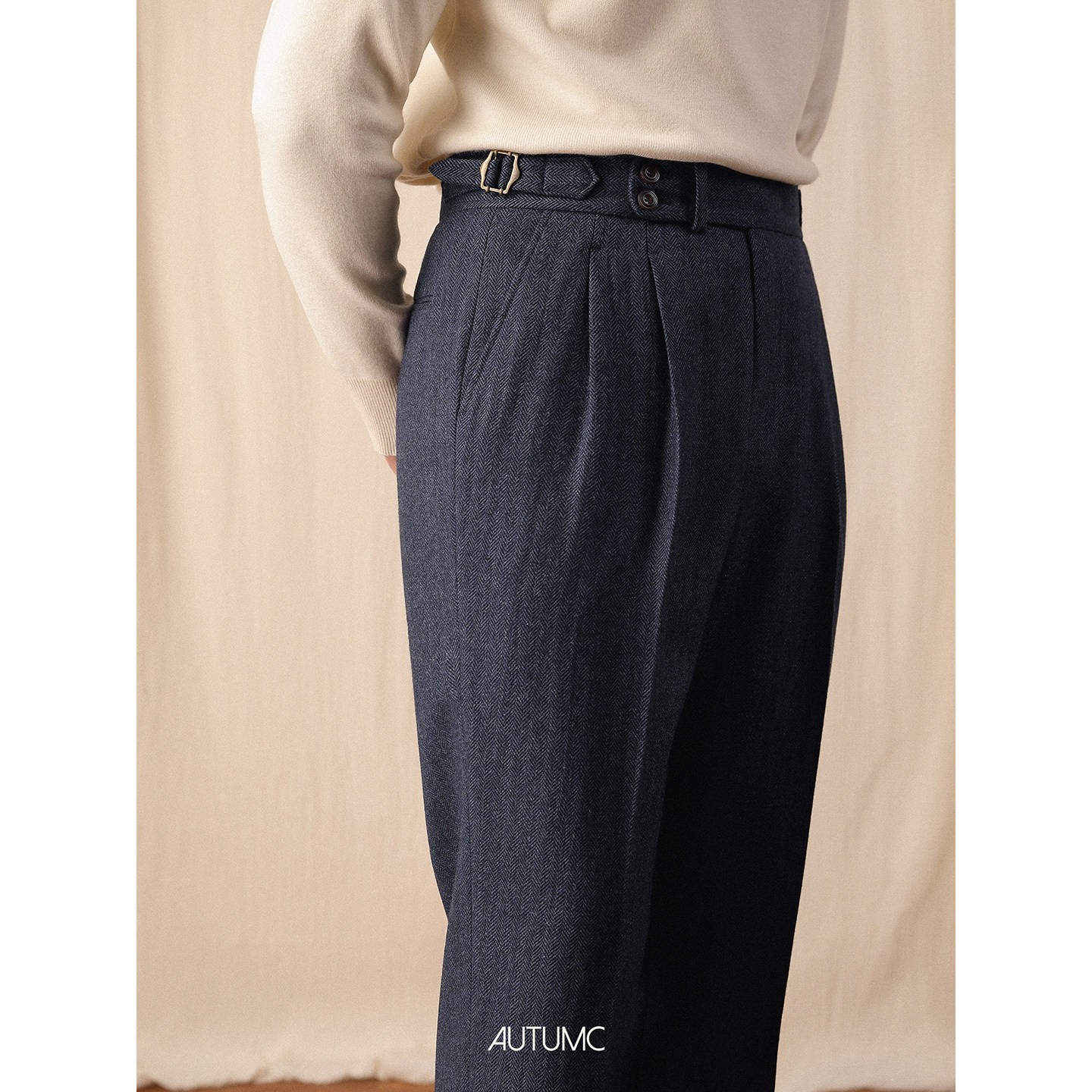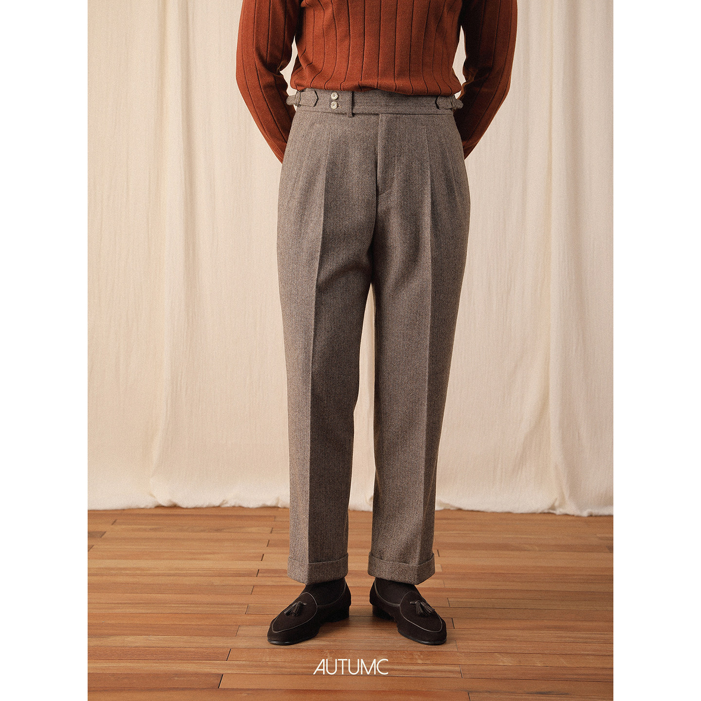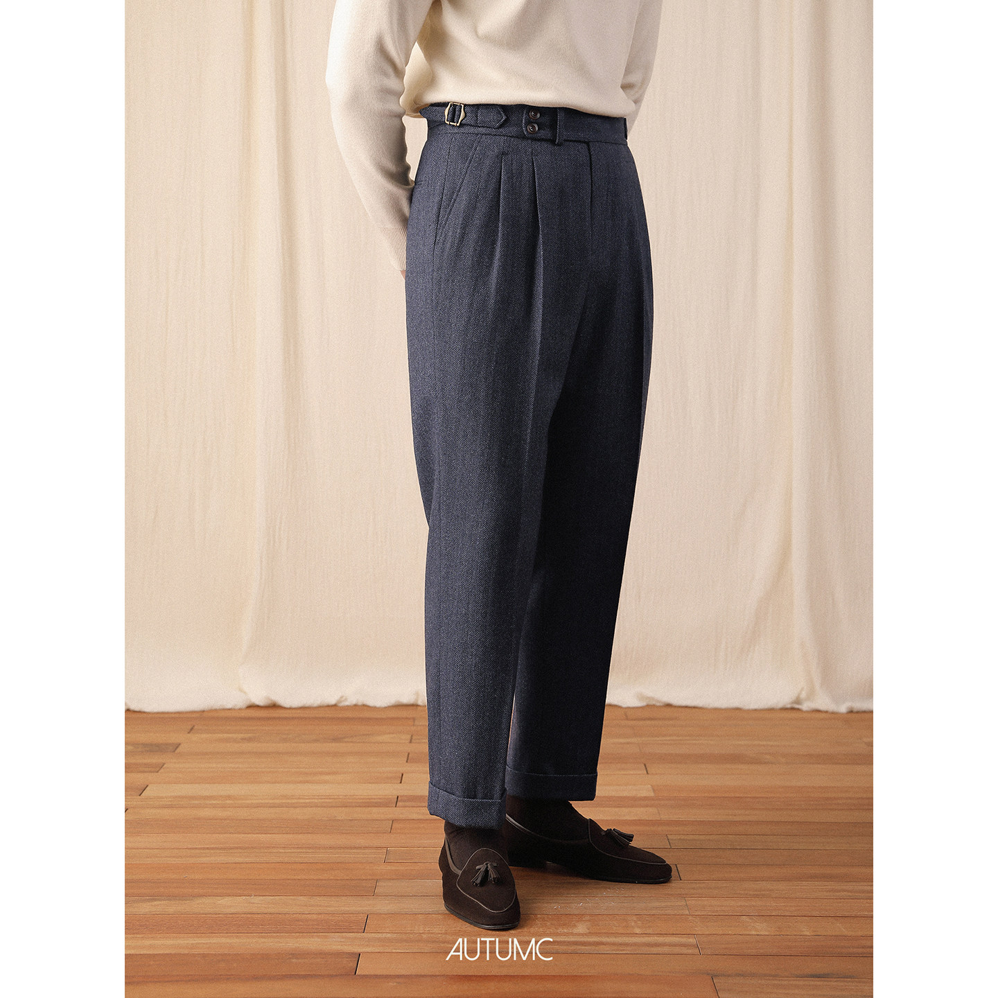 美式复古人字纹粗花呢中高腰微锥型九分西裤羊毛长裤男休闲