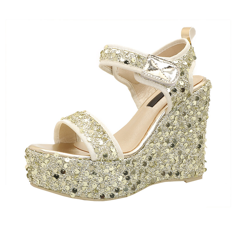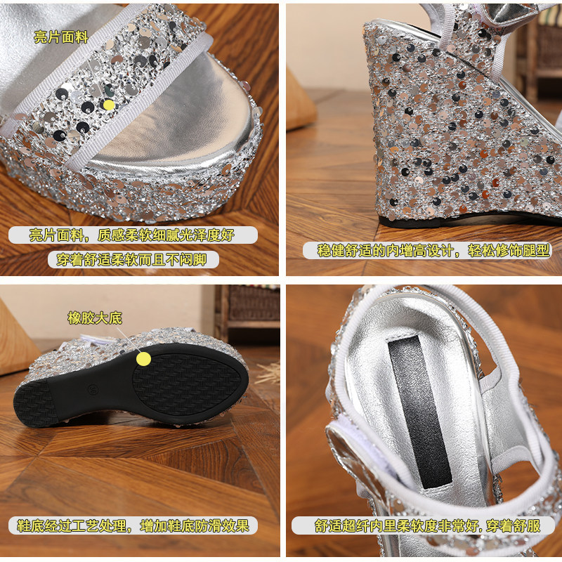 淘宝坡跟一字带凉鞋女夏季新款时尚矮个子亮片12厘米松糕超高跟婚纱鞋