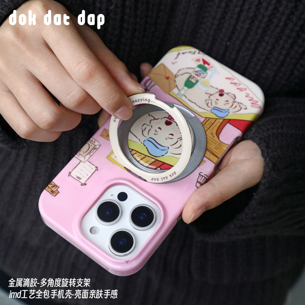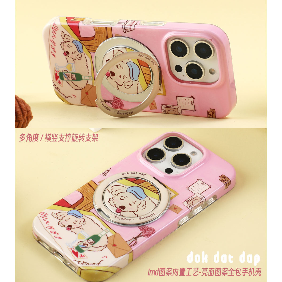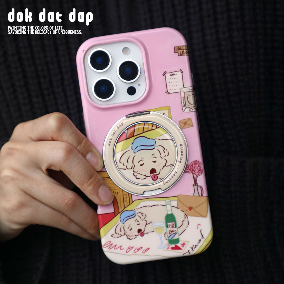 Dokdatdap喝醉狗狗原创设计iPhone 15 Pro/15 Pro Max手机壳,以趣味十足的“醉醺醺”卡通狗狗形象为主角,风格个性可爱,充满治愈感。采用高品质环保材质,精准开孔,贴合机身,提供全方位防摔保护。背部内置隐藏式平面支架,可横竖自由摆放,追剧、视频通话更便捷。适用于iPhone 15系列,兼顾实用与颜值,是日常使用与送礼的贴心之选。每一款都印有独特插画,展现生活小确幸,让手机壳不仅是保护装备,更是表达个性的时尚配饰。