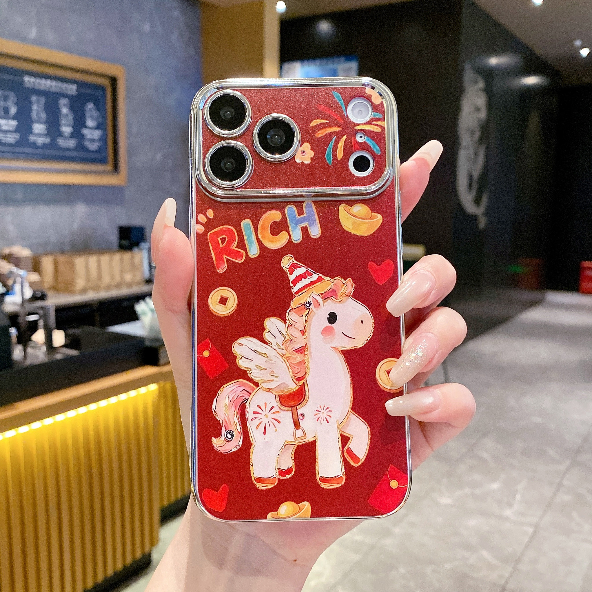 【所有女生的衣橱直播间】新年限定款红色喜庆好运小马手机壳,专为苹果iPhone 17 Pro Max、16 Pro、15 Pro及13系列设计,寓意“马上好运”,迎接龙年转新机!采用全包边防摔设计,精准开孔,贴合机身,兼具美观与实用。喜庆中国红搭配萌趣小马图案,洋溢浓浓年味,既是新年好运的象征,也是日常穿搭的点睛配饰。Y C品质保障,手感细腻,耐用抗黄。无论是自用还是送亲友,都是新年送礼的贴心之选。来直播间,解锁更多新年好运好物,让好运“马”上到来!