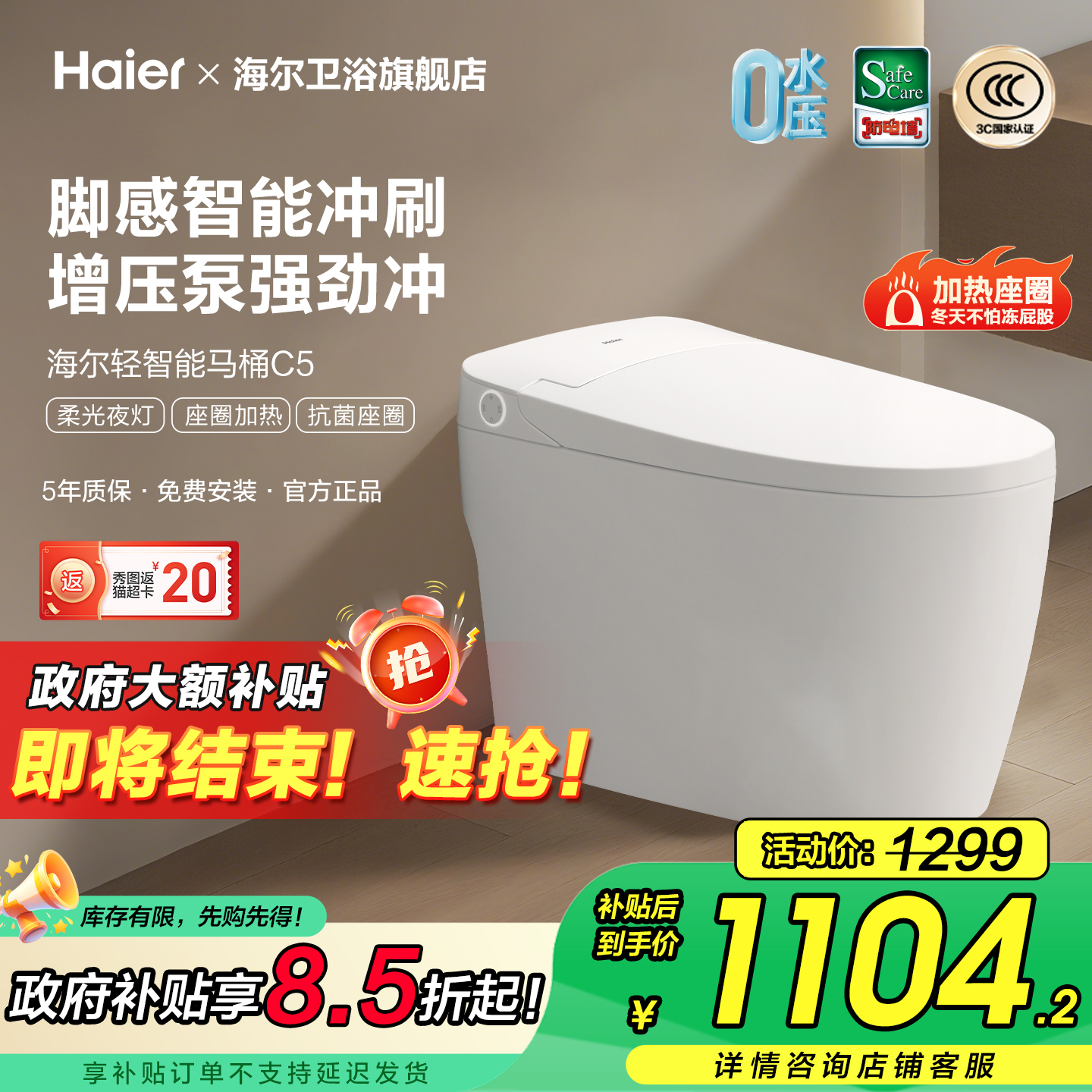 【政府补贴】海尔顶配轻智能马桶是一款集智能科技与便捷体验于一身的高级卫浴产品。它具有自动冲水、坐便器脚感翻盖、圈泡沫盾等强大功能,为用户的日常使用带来极致的舒适与便利。其中,智能冲水功能可以根据用户的实际需求自动调整水温和冲洗模式,为用户带来舒适体验。脚感翻盖设计则让使用者无需手动操作,轻松享受现代科技带来的便捷。此外,海尔顶配轻智能马桶还具有节能环保的特点,符合政府推广的绿色消费理念,享受政府补贴优惠。