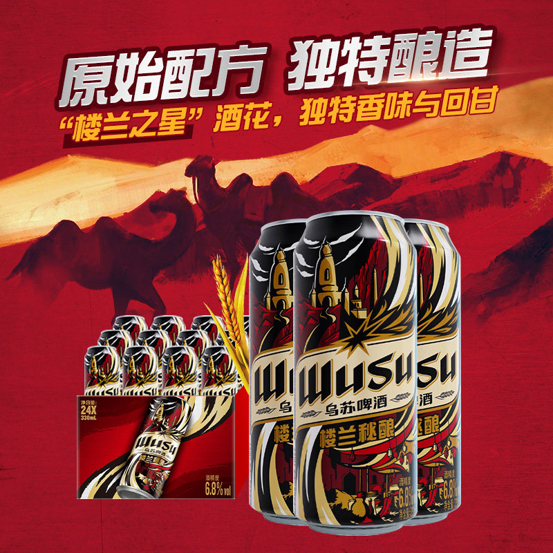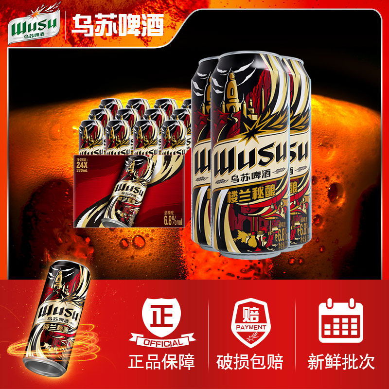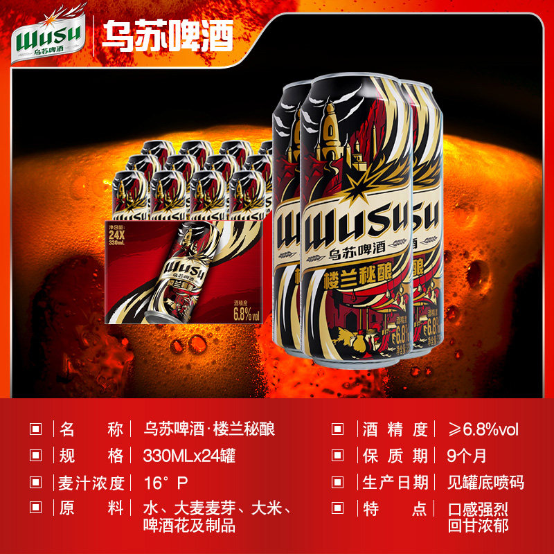 天猫【乌苏啤酒】楼兰秘酿330ml*12罐听装啤酒整箱非原箱批发高度烈性