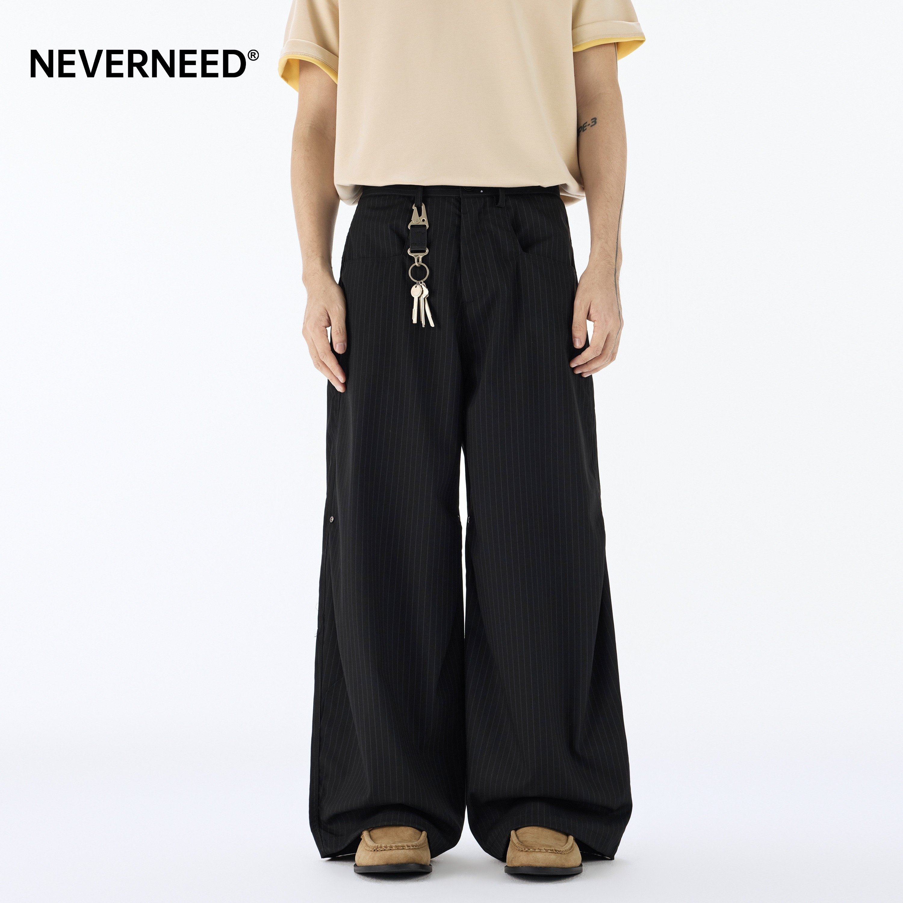 淘宝NEVERNEED条纹直筒休闲西裤男女春季美式老钱风垂坠感A字阔腿长裤