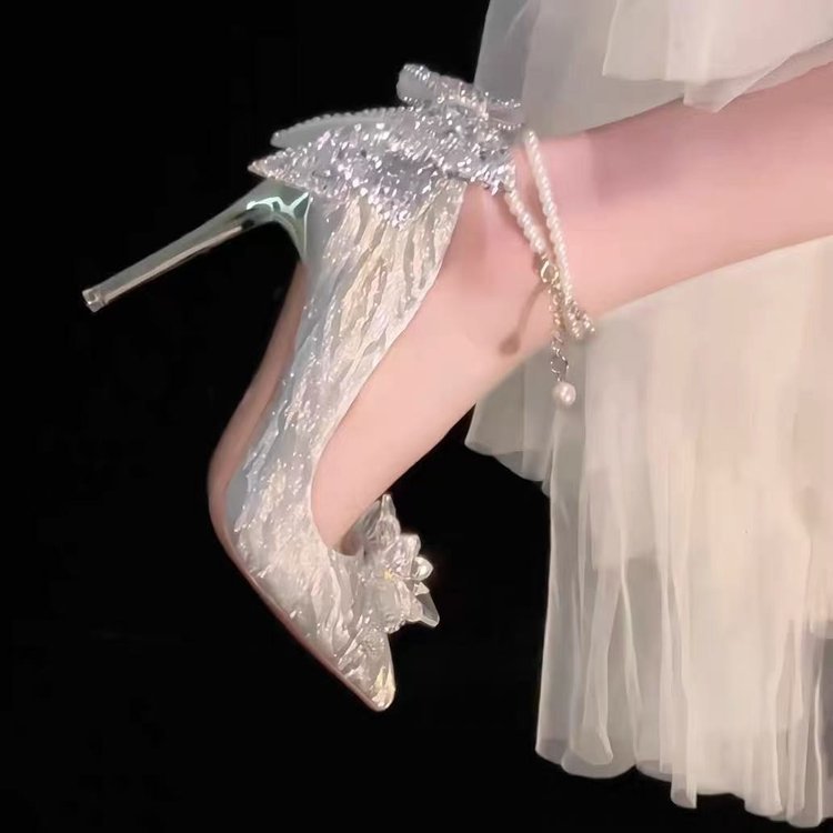 高跟鞋女2025年春季新款细跟尖头法式透明闪水晶单鞋水钻婚鞋银色