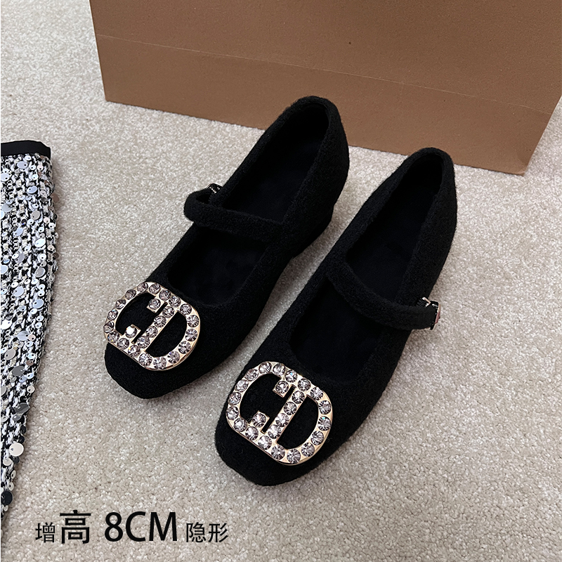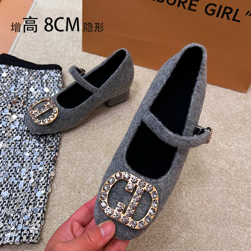 淘宝小个子增高8CM玛丽珍水钻浅口单鞋女2025年新款冬灰色加绒毛毛鞋