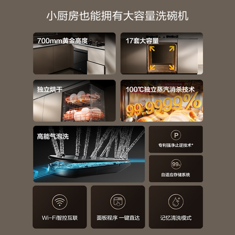 【新品】方太嵌入式洗碗机T70灶下全自动小型家用烘干一体17套01,专为现代厨房设计,巧妙嵌入灶下空间,节省台面面积。搭载17套大容量碗篮,轻松应对家庭聚餐需求。采用高能气泡洗技术,深层瓦解油污,洁净更彻底。配备热风烘干与余温烘干双效系统,快速干爽抑菌,避免二次污染。智能感应油污,自动调节洗涤模式,省水省电更省心。运行低至45分贝,安静不打扰。支持APP远程操控,预约洗涤更便捷。一体成型不锈钢内胆,耐用易清洁。方太T70,以科技重塑厨房洁净体验,让洗碗成为享受。