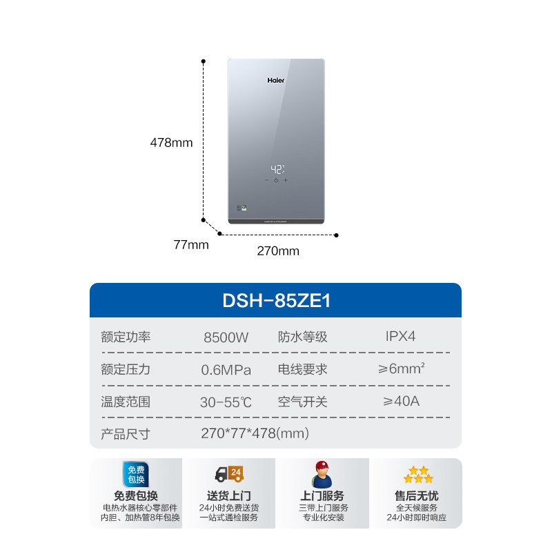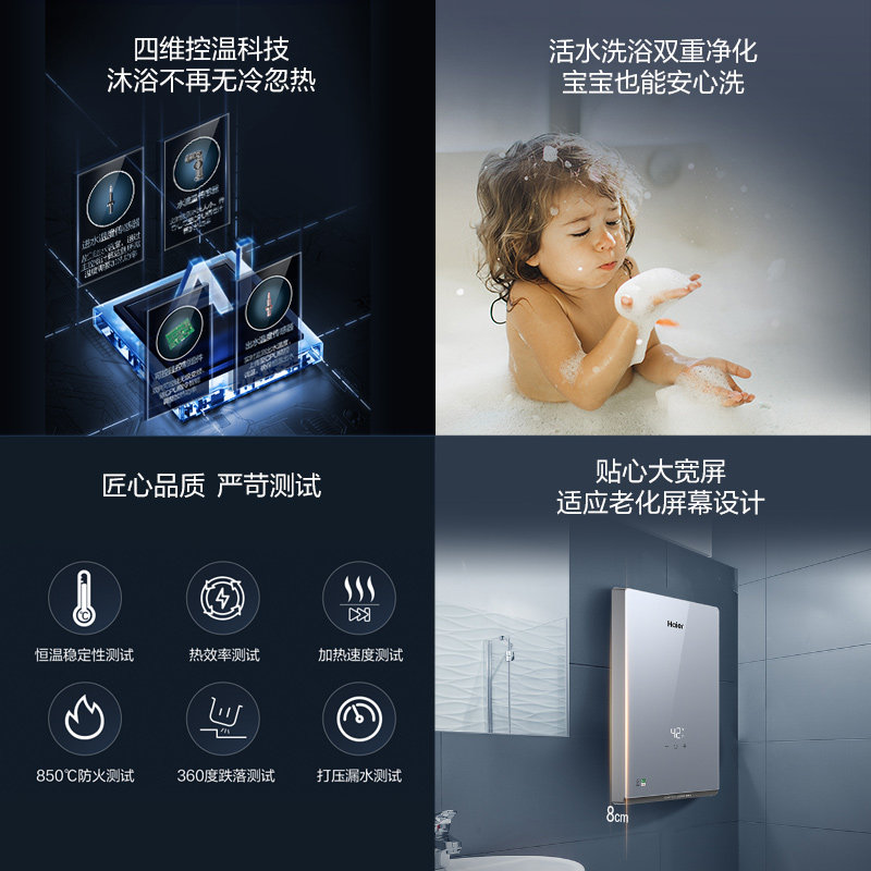 天猫国家补贴海尔即热式电热水器8500W家用恒温洗澡一级能效发廊85ZE1