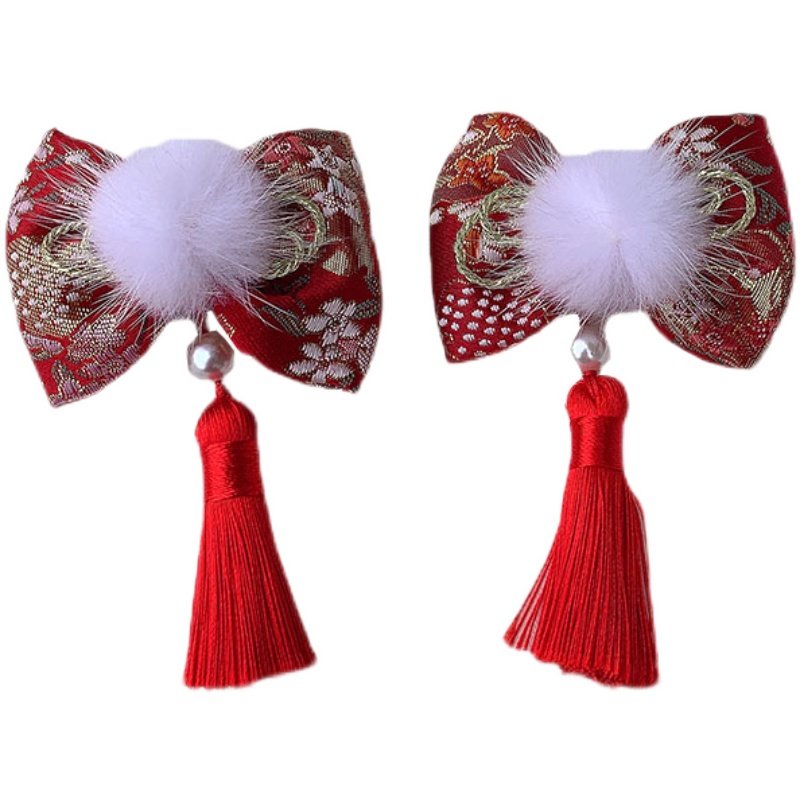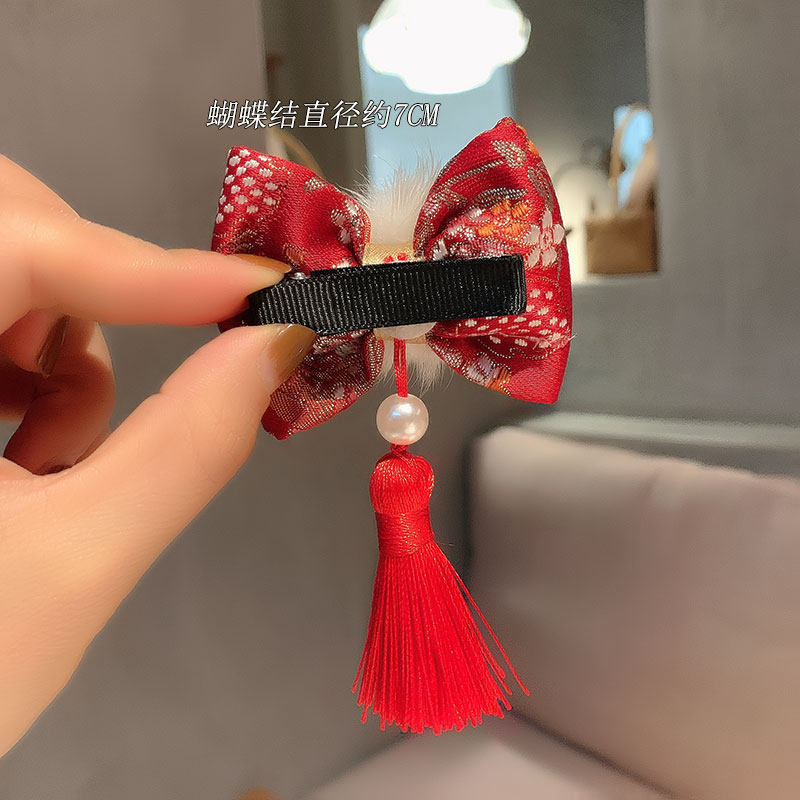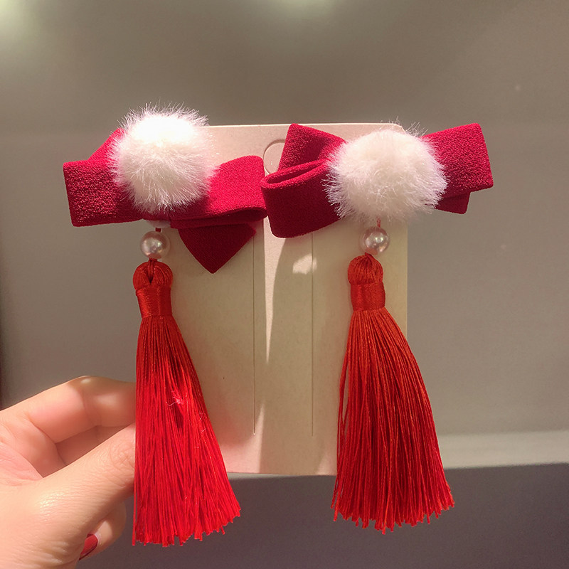 淘宝儿童发饰过年中国风流苏毛球汉服发夹宝宝蝴蝶结拜年头饰发卡喜庆
