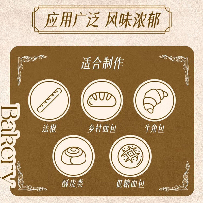 金像牌T55高筋传统法式面包粉,精选优质小麦精制而成,专为制作正宗法式面包而设计。其蛋白质含量适中,筋度稳定,能充分形成面筋网络,赋予面包良好的延展性与弹性。适用于法棍、吐司等多种欧式面包制作,成品外皮酥脆、内部柔软且富有嚼劲,散发天然麦香。1kg装设计,满足家庭烘焙与小型烘焙坊需求。无论是手工揉面还是配合面包机使用,都能轻松操作,成功率极高。金像品牌品质可靠,是追求高品质烘焙体验的理想之选,让每一次烘焙都充满法式风情与专业质感。