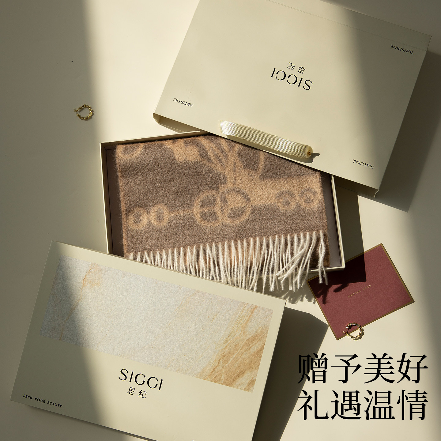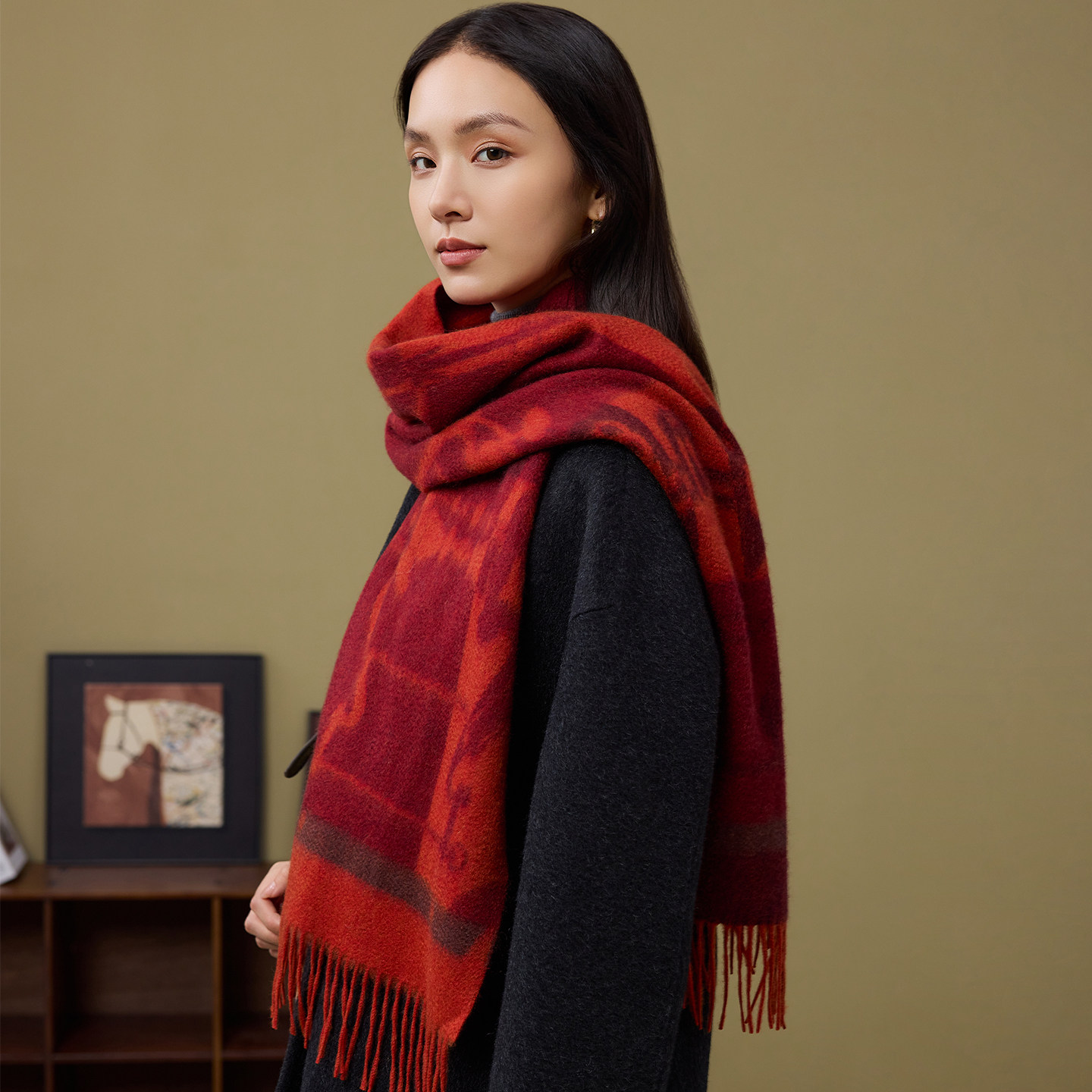 天猫siggi 山羊绒围巾中国红新年提花老钱披肩马年本命年女士新年礼物