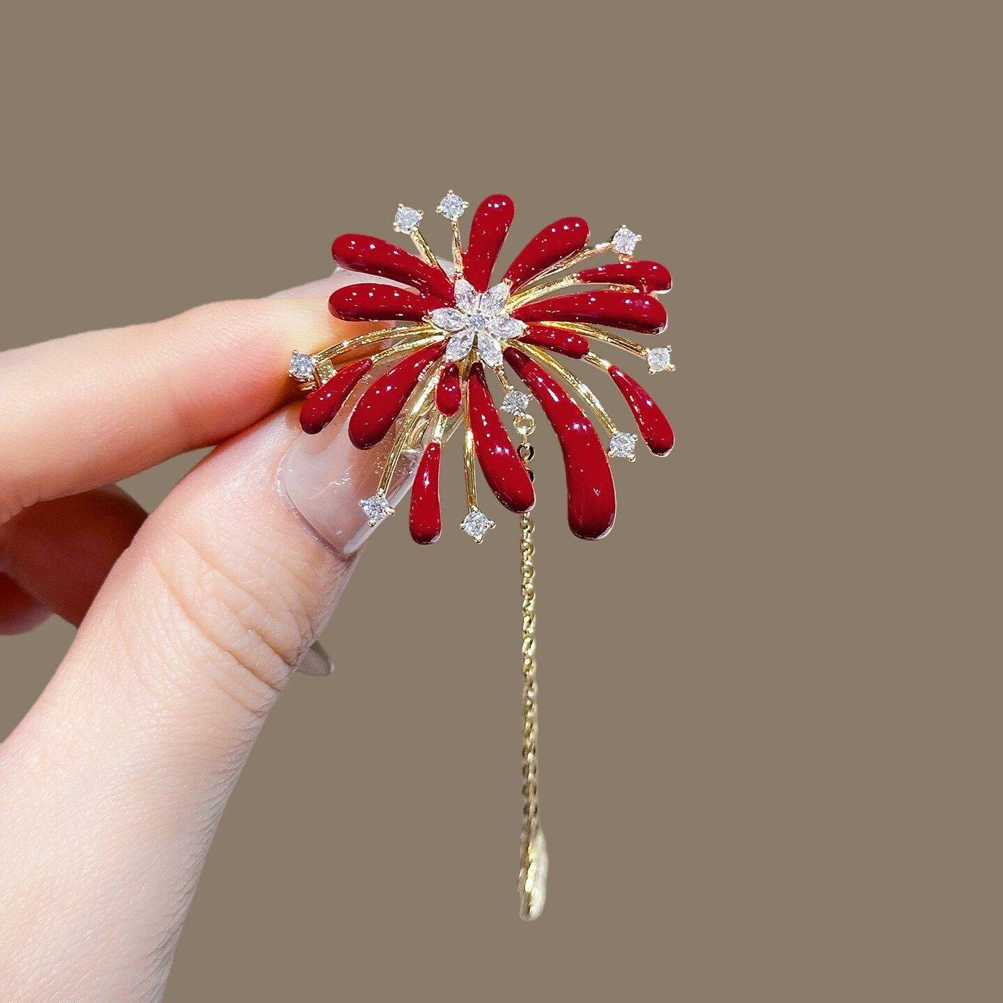 淘宝红色烟花胸针女水钻流苏别针奢华气质西装外套配饰新年礼物胸花女