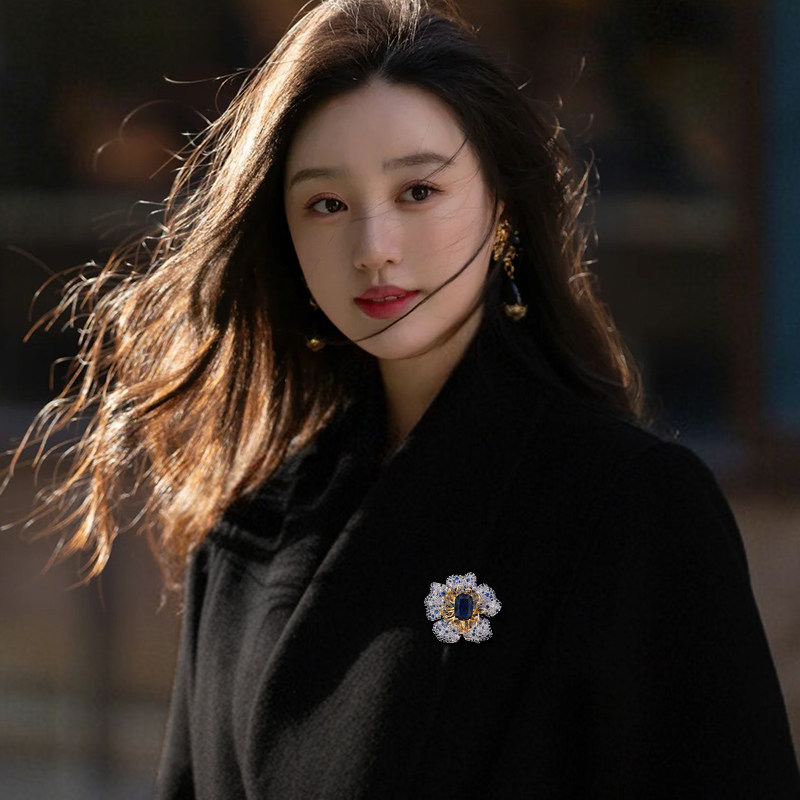 淘天然蓝色水晶石花朵胸针 高档复古小众设计感 巴洛克珍珠西装别针