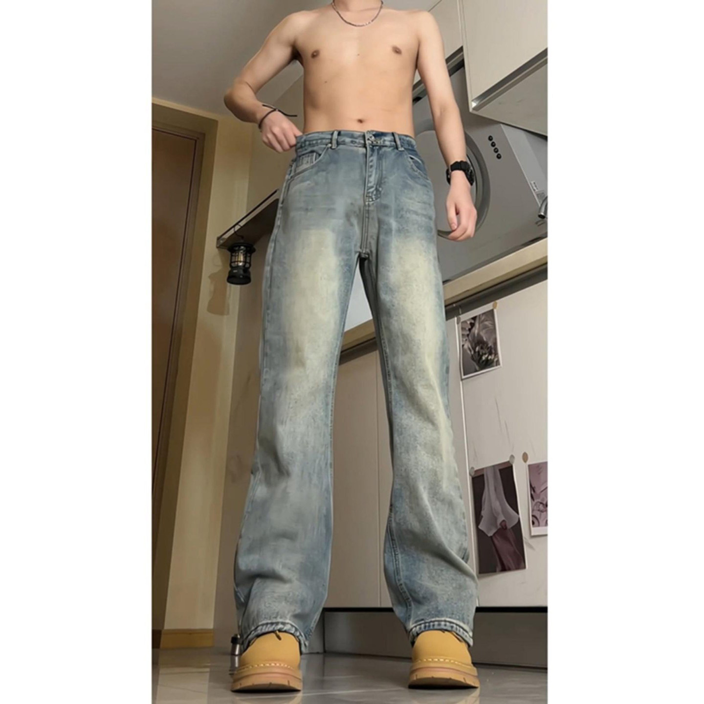 淘NEVERNEED水洗宽松直筒牛仔裤男春季美式高街vibe做旧磨破阔腿裤