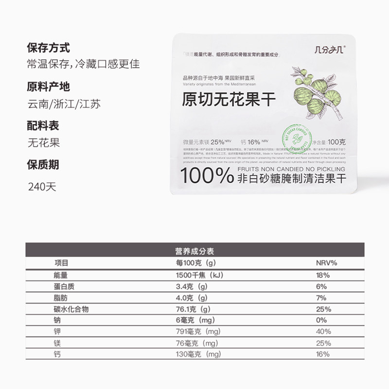 几分之几原切无花果干,精选优质新鲜无花果,采用低温慢烘工艺,完整保留果肉纤维与天然营养,非蜜饯、无添加糖、无硫熏、无防腐剂,真正还原水果本味。每一片都是原果切制,口感软糯香甜,自然回甘,是健康即食的理想选择。作为风靡网络的天然零食,不仅适合日常休闲,更成为孕妇、宝妈及注重健康人群的首选。无花果富含膳食纤维、维生素和矿物质,助力肠道健康,补充能量。几分之几坚持天然理念,让每一口都安心、纯净、营养,是追求高品质生活的您不可错过的健康美味。