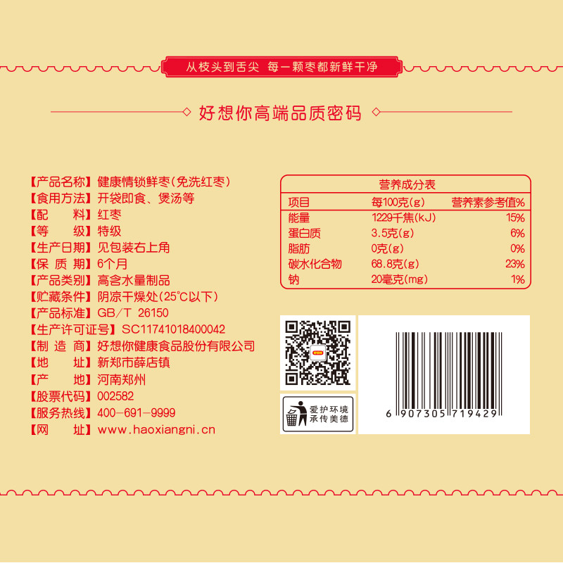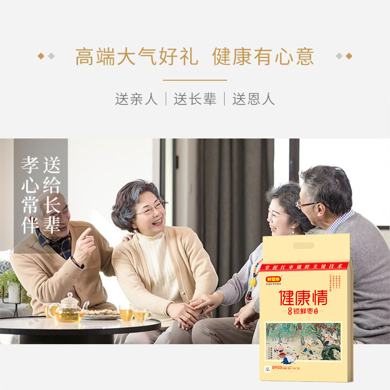 【门店同款】好想你健康情红枣礼盒装,精选优质新疆大枣,颗颗饱满、肉厚核小,天然蜜饯工艺,口感软糯香甜,免洗即食,方便健康。礼盒包装精美大气,寓意“红”运当头、情意绵绵,是节日走亲访友、孝敬长辈、馈赠客户的理想选择。产品严格把控品质,无添加防腐剂,保留红枣天然营养,富含维生素与膳食纤维,老少皆宜。无论是自用还是送礼,都能传递浓浓心意与健康祝福。好想你品牌专注红枣产业多年,口碑信赖,让您吃得安心、送得体面。佳节将至,用一份健康好礼,表达心中最真挚的情感。