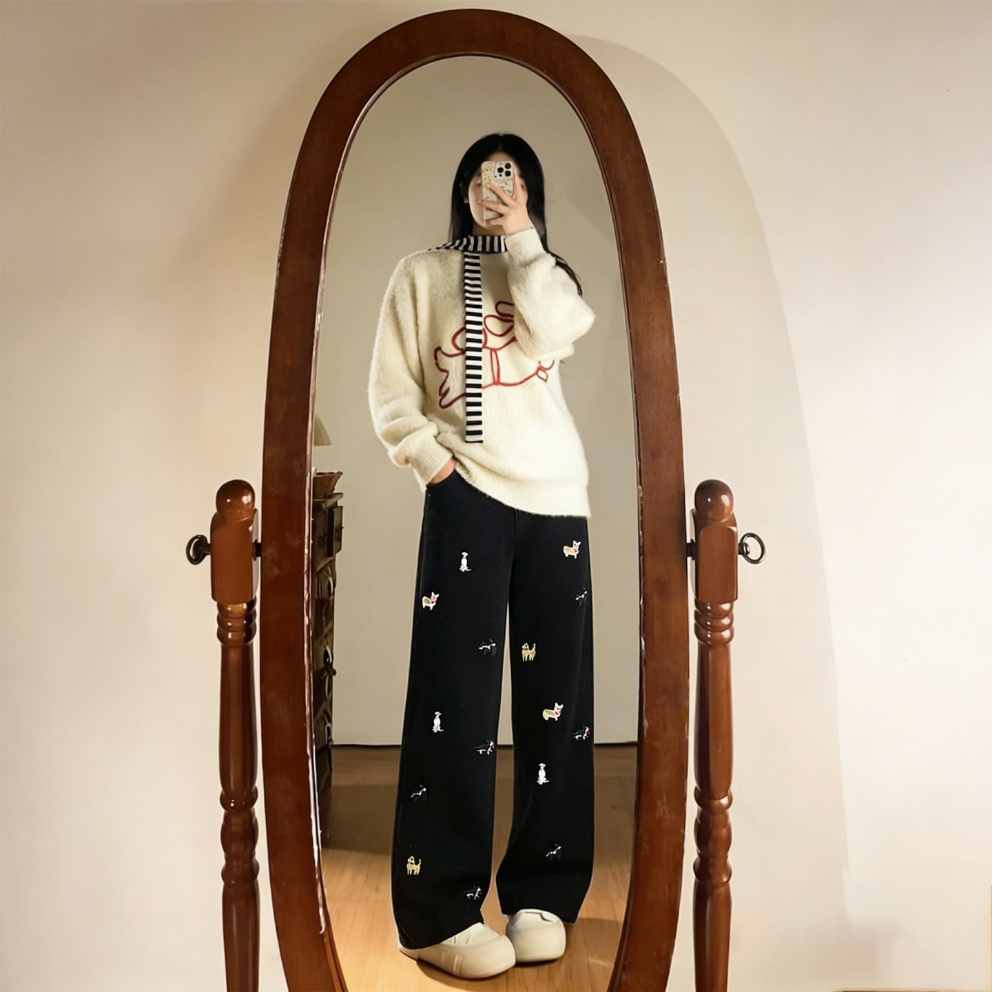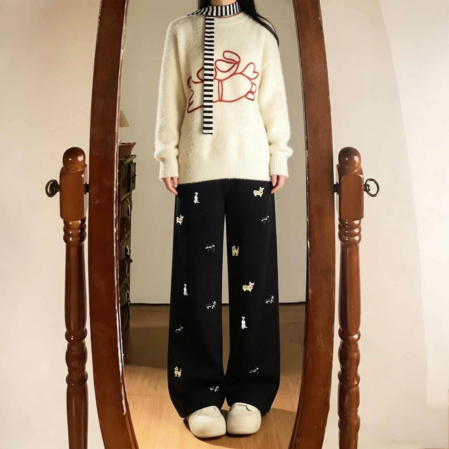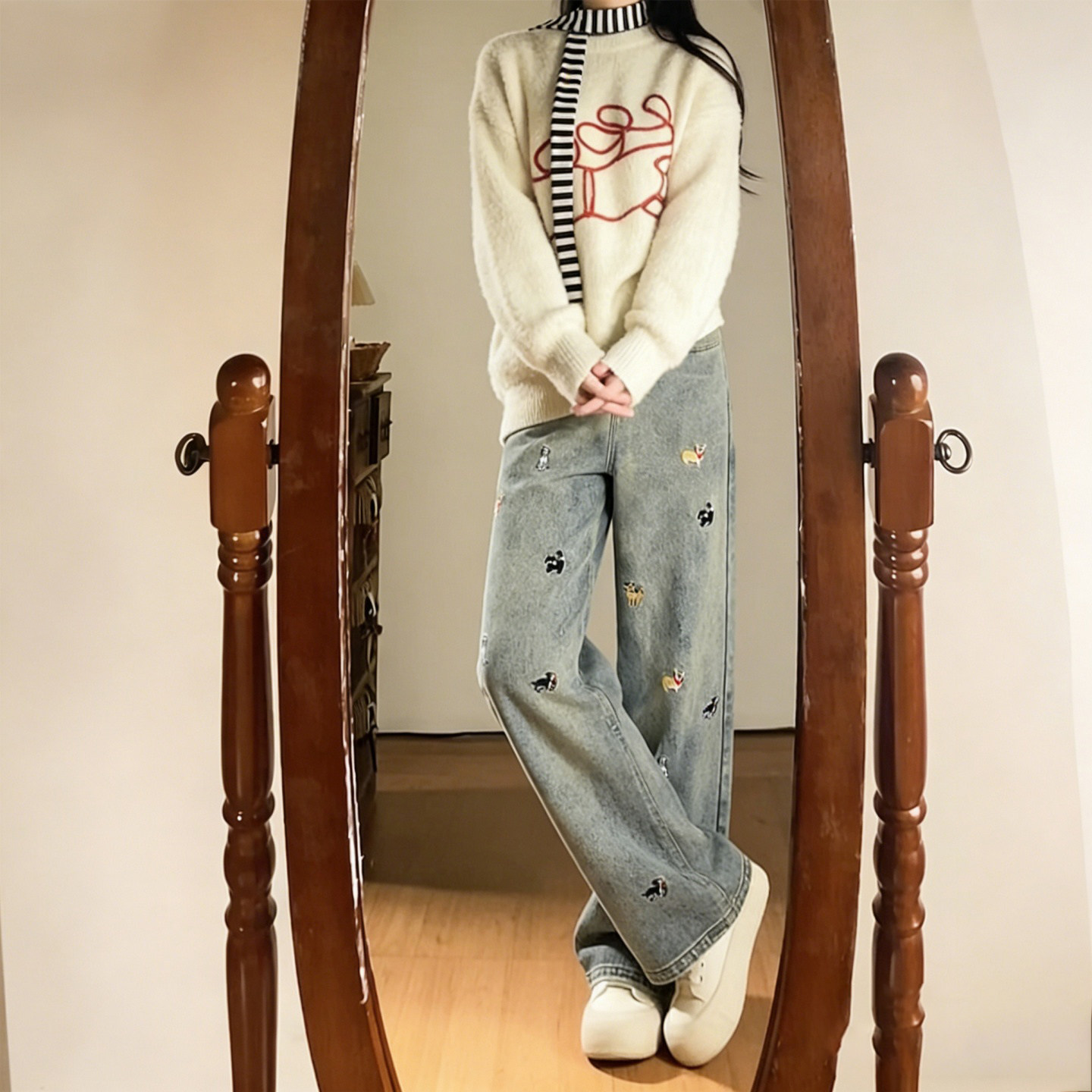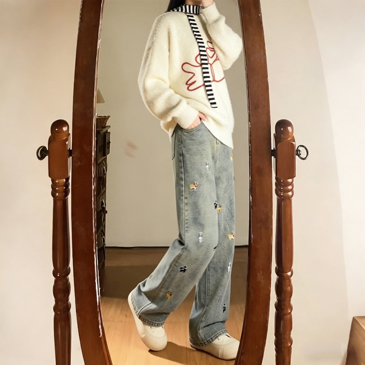 这款特大码女装专为胖MM设计,融合复古潮流与舒适实穿。高腰剪裁巧妙拉长腿部线条,视觉显瘦效果出众。宽松直筒阔腿版型包容各种身材,拖地长度随性慵懒,轻松打造时髦造型。裤身点缀精致小狗刺绣,增添俏皮趣味,打破单调感。选用优质牛仔面料,挺括有型且透气耐穿。无论是搭配简约T恤、复古衬衫还是针织衫,都能轻松驾驭日常、通勤或休闲场合,真正实现百搭不挑人。专为大码女性量身打造,兼顾美感与舒适,让每一位女生都能自信展现独特魅力。